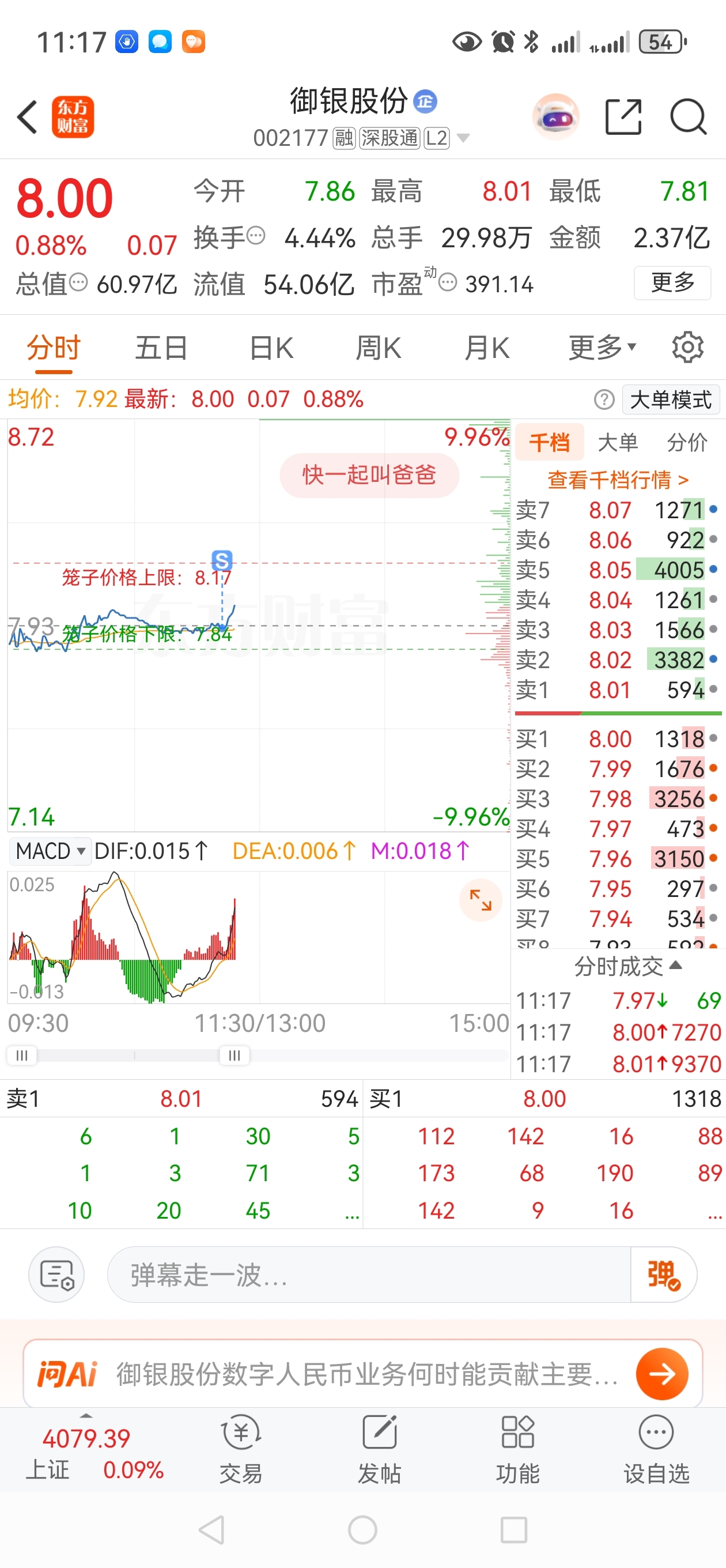 $御银股份(SZ002177)$ 买了500股的卖了就涨,少挣15块钱,来感谢我吧