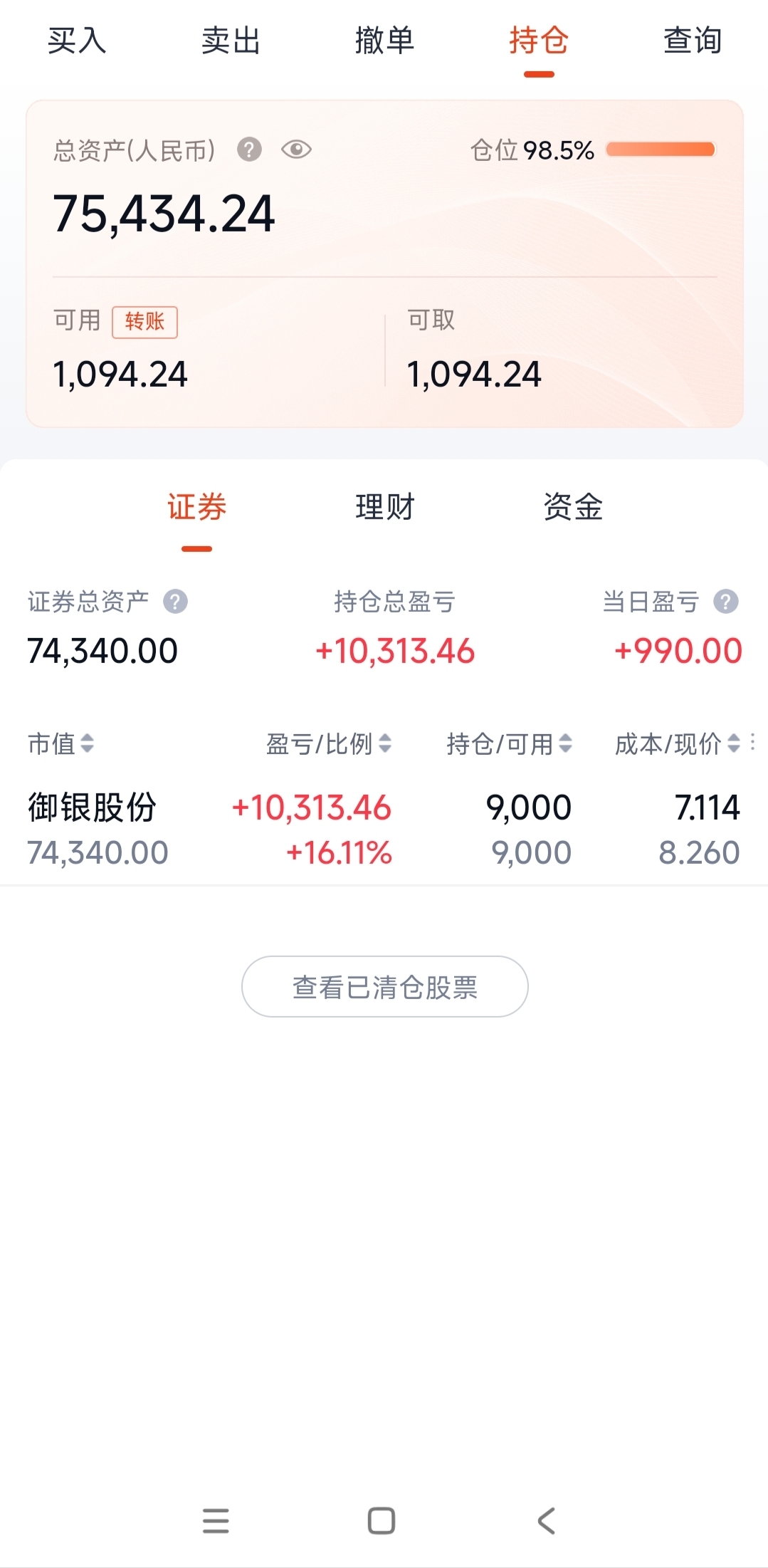 新手宝妈,挪子金库,9万入市,勇闯大A。实盘交易第142天,今日盈利990元。今日持有御银股份。