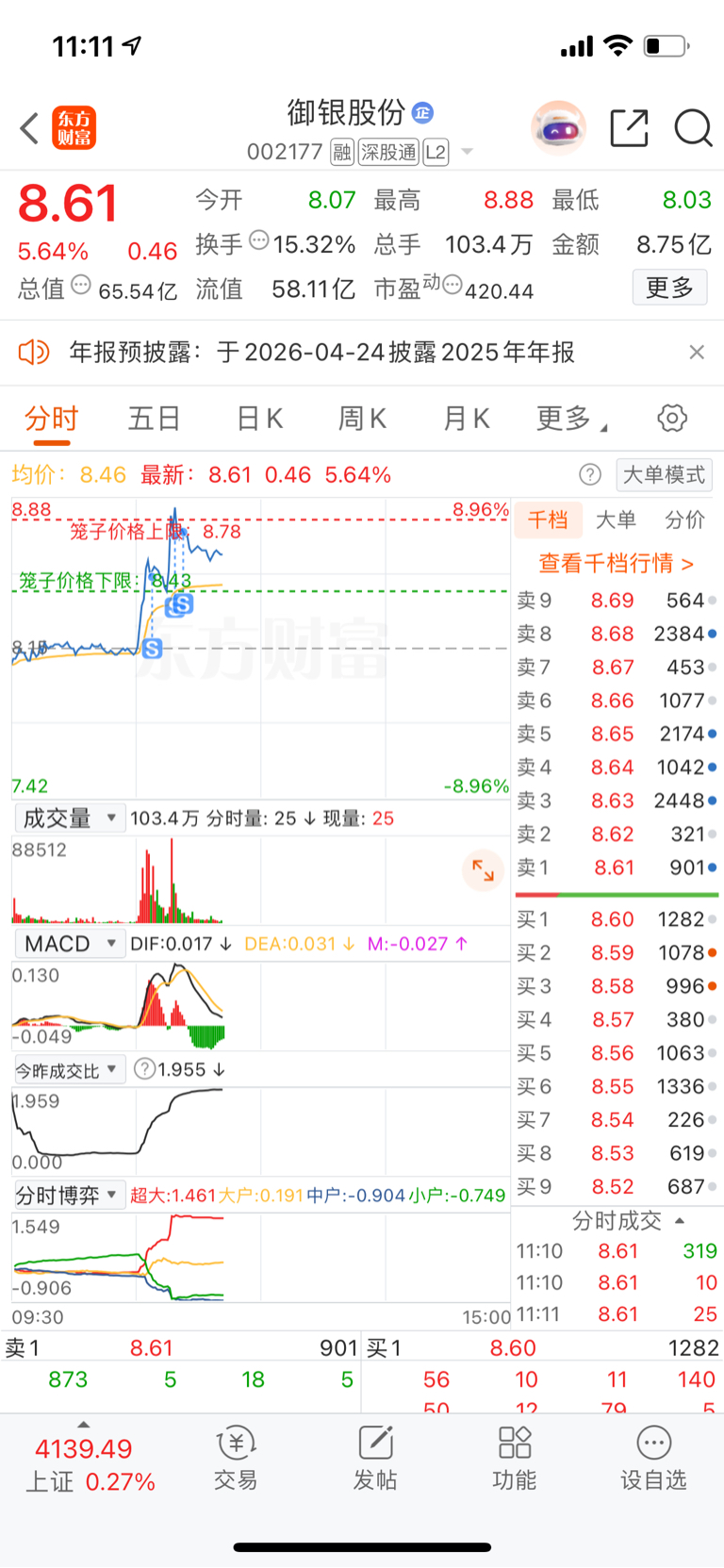 $御银股份(SZ002177)$ 下午要放量的话直接涨停,不放量强势最好站住8.60,走弱的话估计收盘8.48