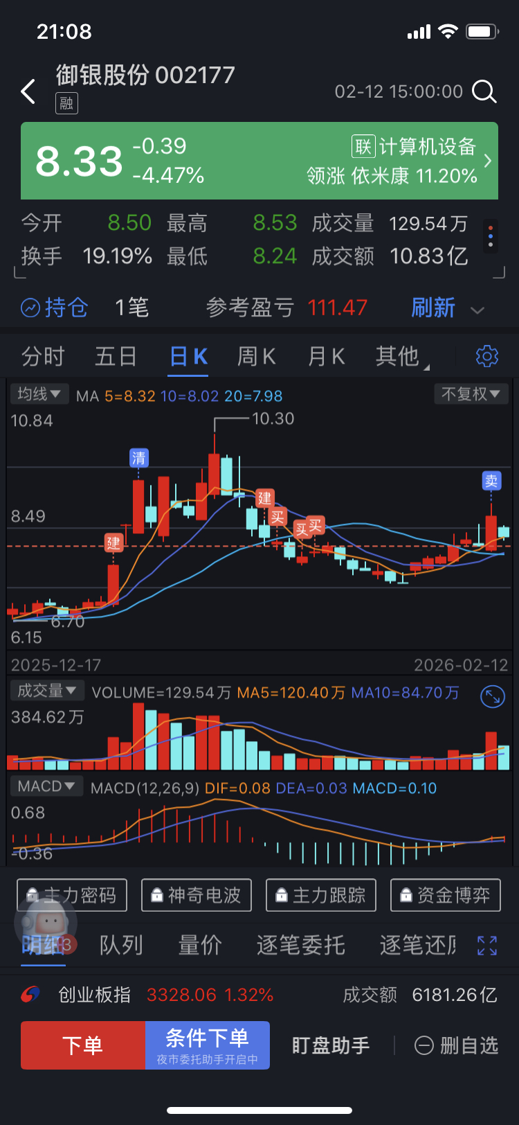 $御银股份(SZ002177)$ 昨天板上减了一半,明天止跌买回。长线看涨,必竟瘦死的骆驼比马大,龙头股不用怕。