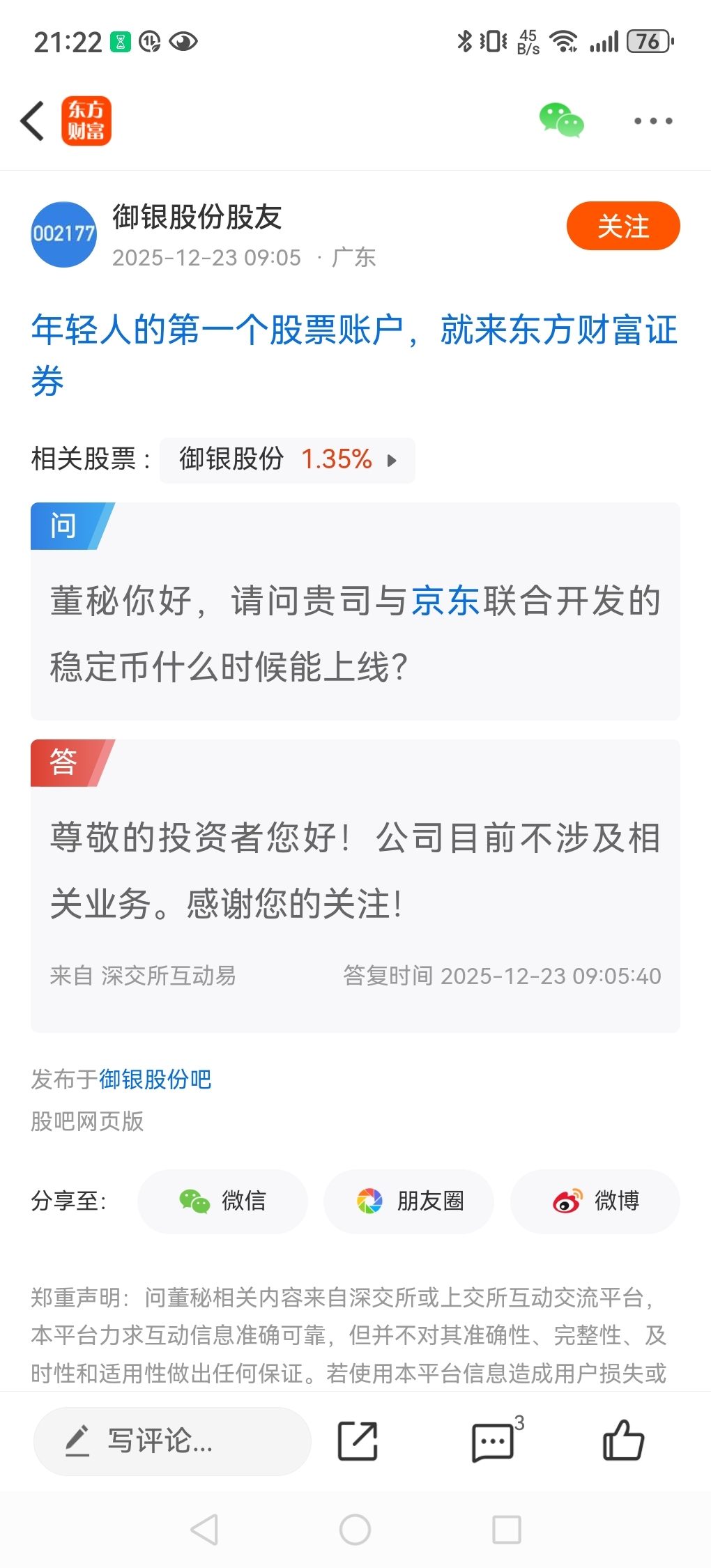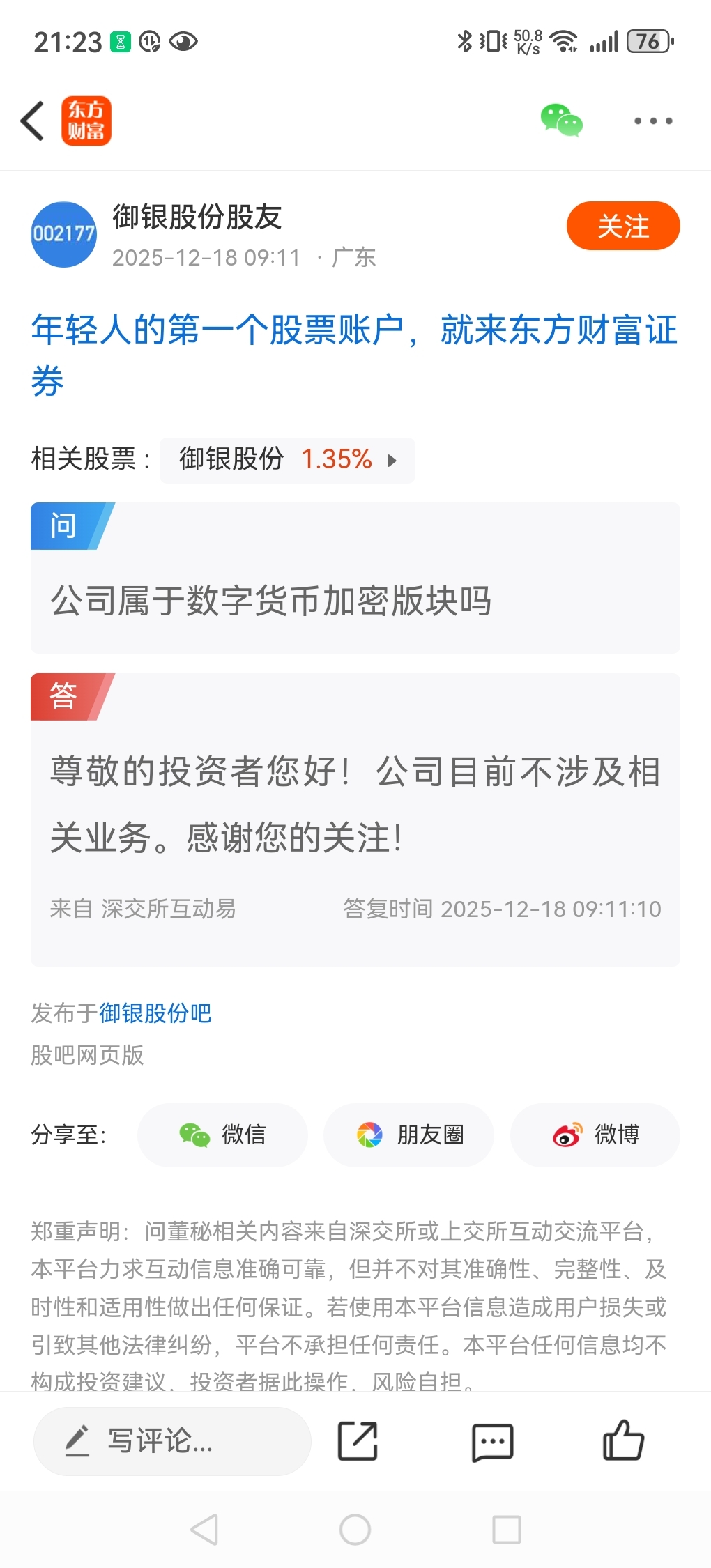 温馨提示: 1.根据《证券法》规定,禁止编造、传播虚假信息或者误导性信息,扰乱证券市场;2.用户在本社区发表的所有资料、言论等仅代表个人观点,与本网站立场无关,不对您构成任何投资建议。用户应基于自己的独立判断,自行决定证券投资并承担相应风险。《东方财富社区管理规定》