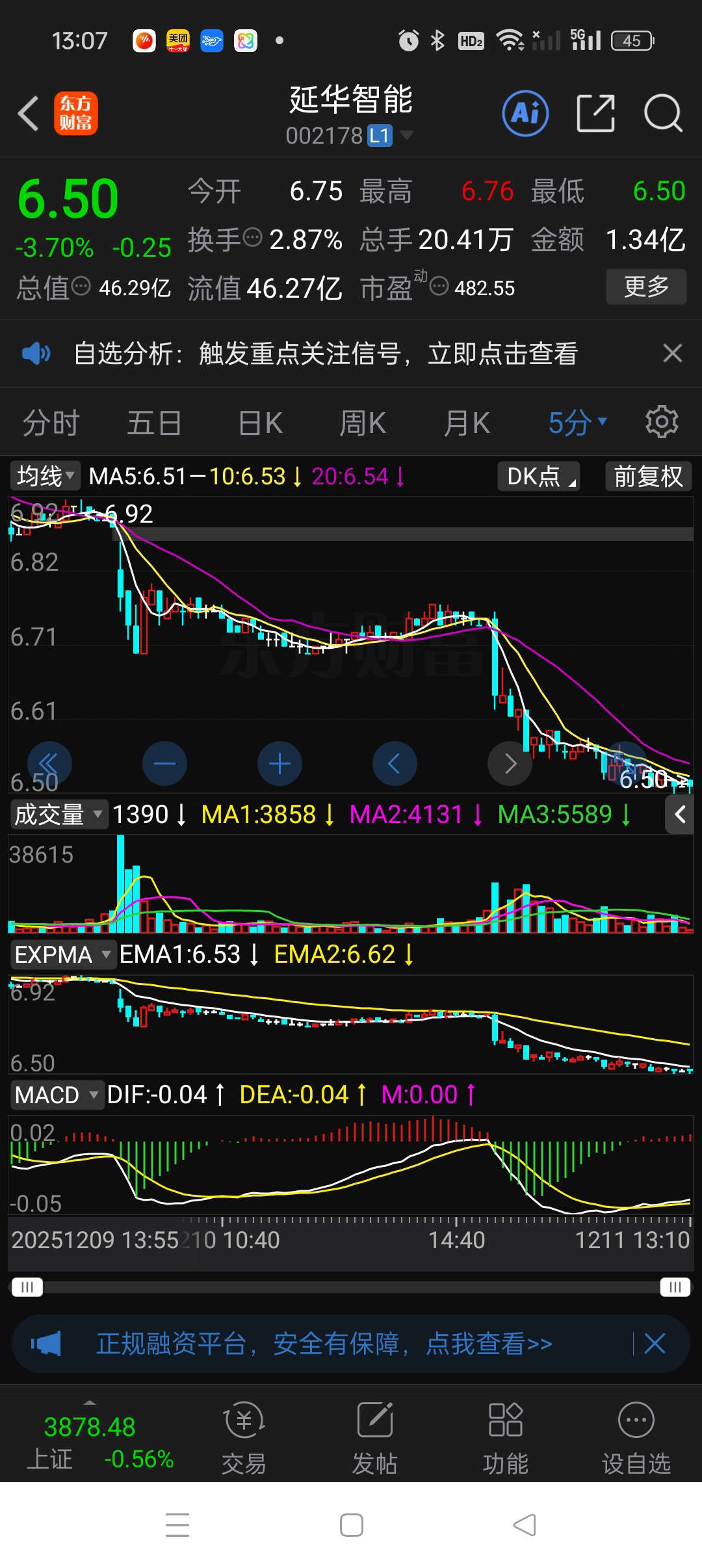 $延华智能(SZ002178)$ 5分钟指标钝化,有第一波的底背离,想不想买各凭各悟