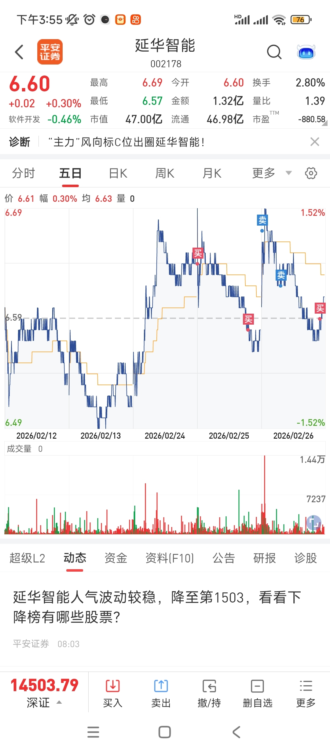 $延华智能(SZ002178)$ 尾盘买回来一半