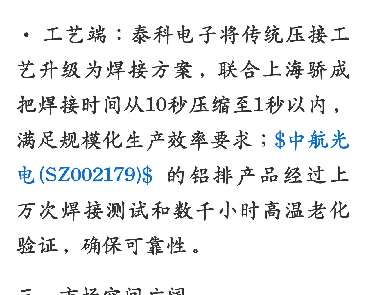 $中航光电(SZ002179)$ 中航光电 的铝排产品经过上万次焊接测试和数千小时高温老化验证,确保可靠性。