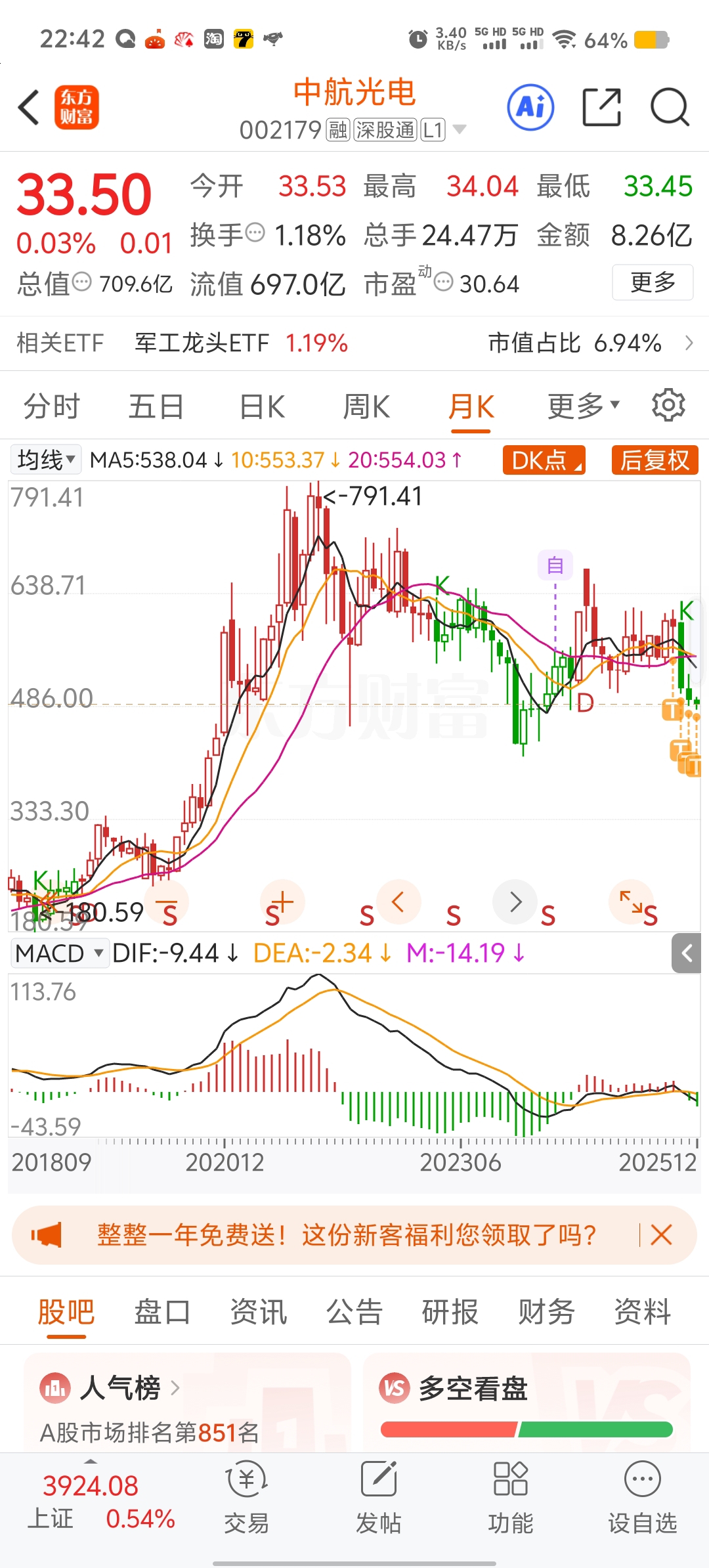 $中航光电(SZ002179)$ 这月线看着都吓人,T麻了。调整空间还是不小,赚个三瓜两枣就行了!