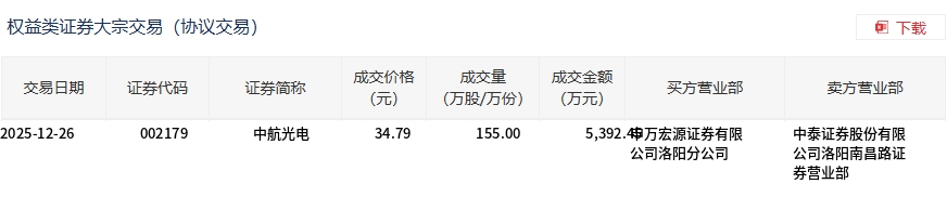 中航光电今日大宗交易平价成交155万股,成交额5392.45万元