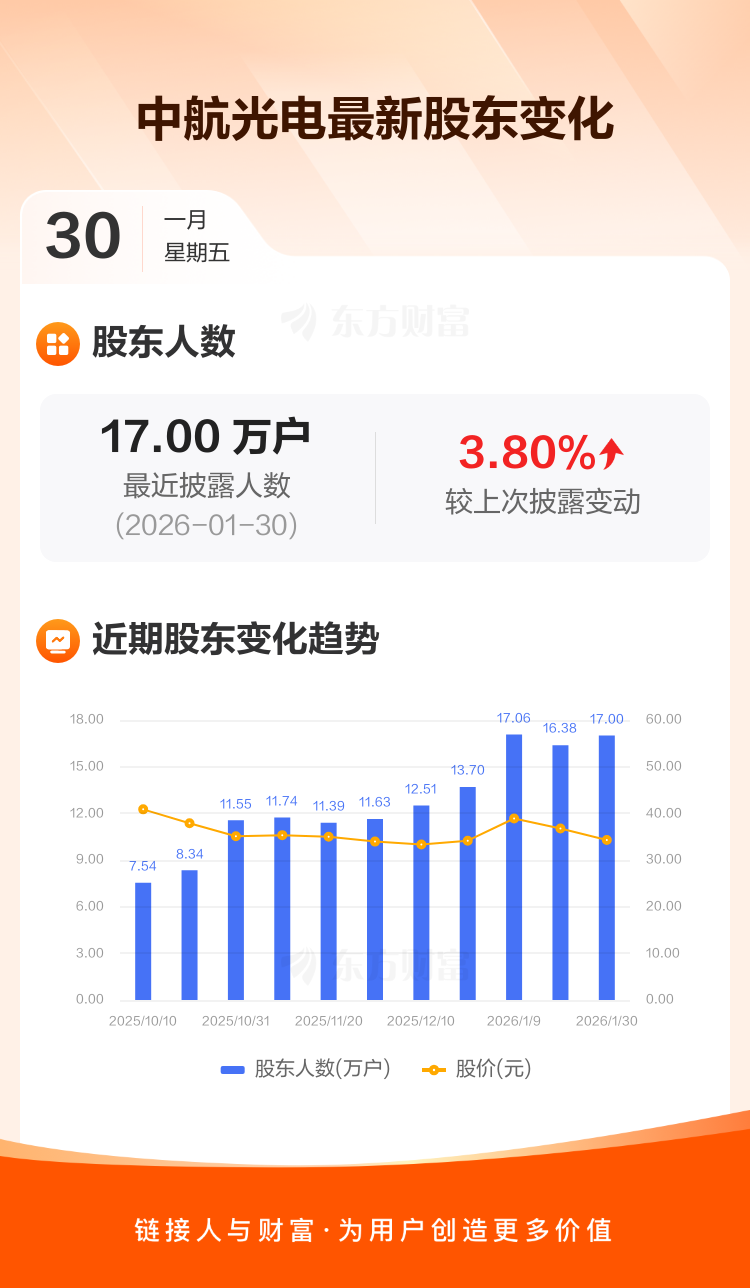 中航光电:截至1月30日最新股东户数17.00万户,较上期增加3.80%