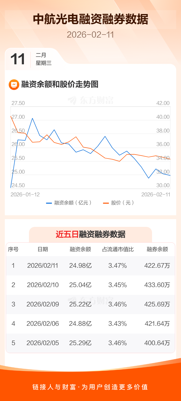 交易所最新数据显示,中航光电于2026年2月11日获融资买入9618.08万元,融资偿还1.02亿元,当日融资净偿还628.46万元。目前,该股融资余额24.98亿,占流通市值比例为3.47%。