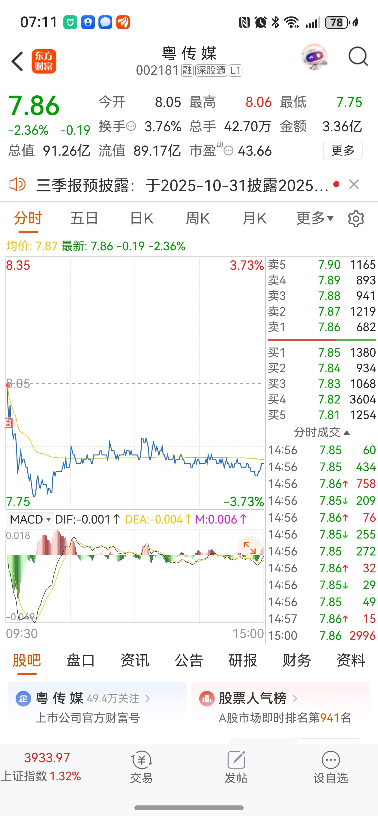 $粤 传 媒(SZ002181)$ 是谁8.06卖给我的,我不要还给你,我明天买可以吗。