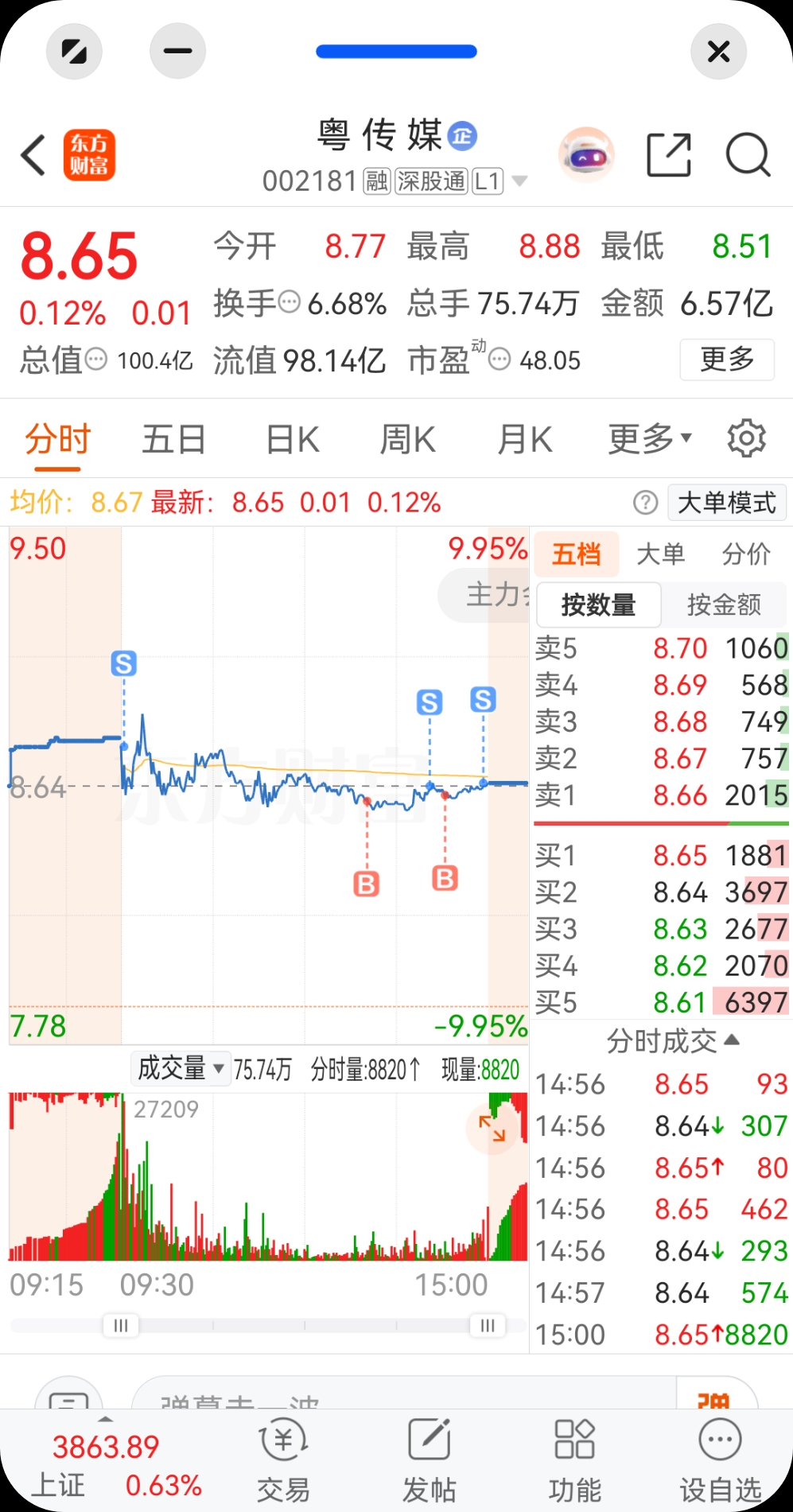 $粤 传 媒(SZ002181)$ 平收也赚两个点的收益