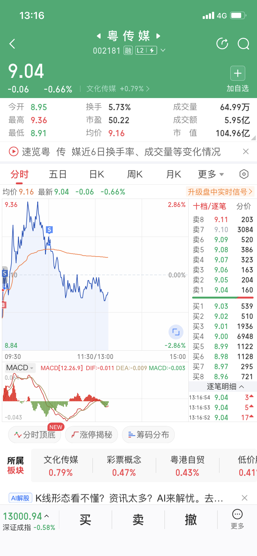 $粤 传 媒(SZ002181)$ 可惜没卖到最高点,不可能天天涨