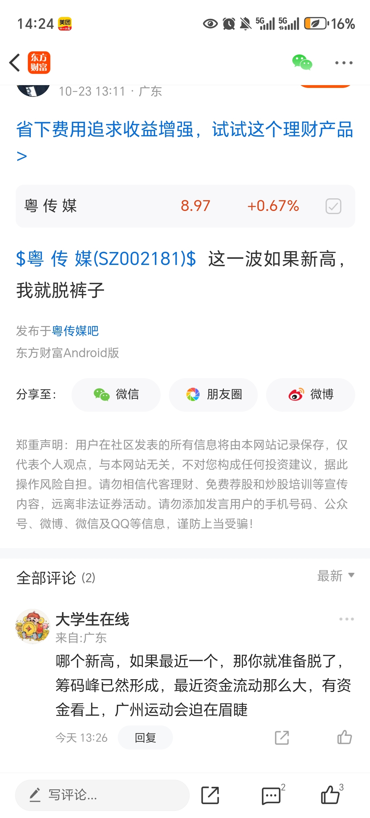 $粤 传 媒(SZ002181)$ 不拉升太高是为了防止散户追,其他资金强筹,就这样平盘,尾盘主力拿了单的,广州运动会迫在眉睫,这两天暴力洗盘,盘中看了一下大力吸筹