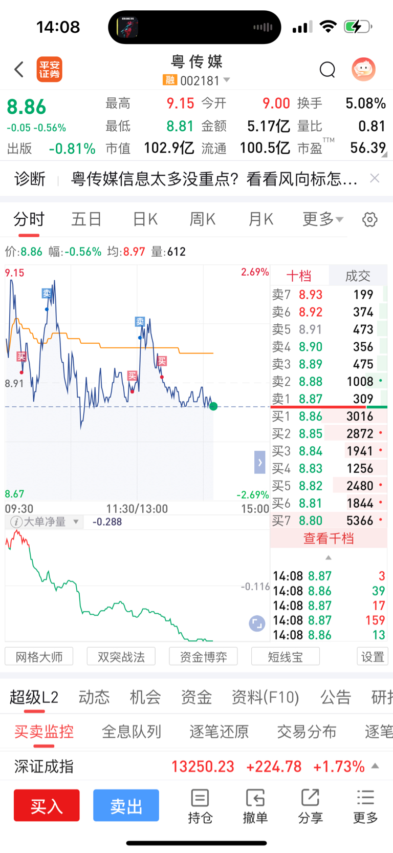 $粤 传 媒(SZ002181)$ 还是广州人做庄有点实力,精准控盘收盘8.88