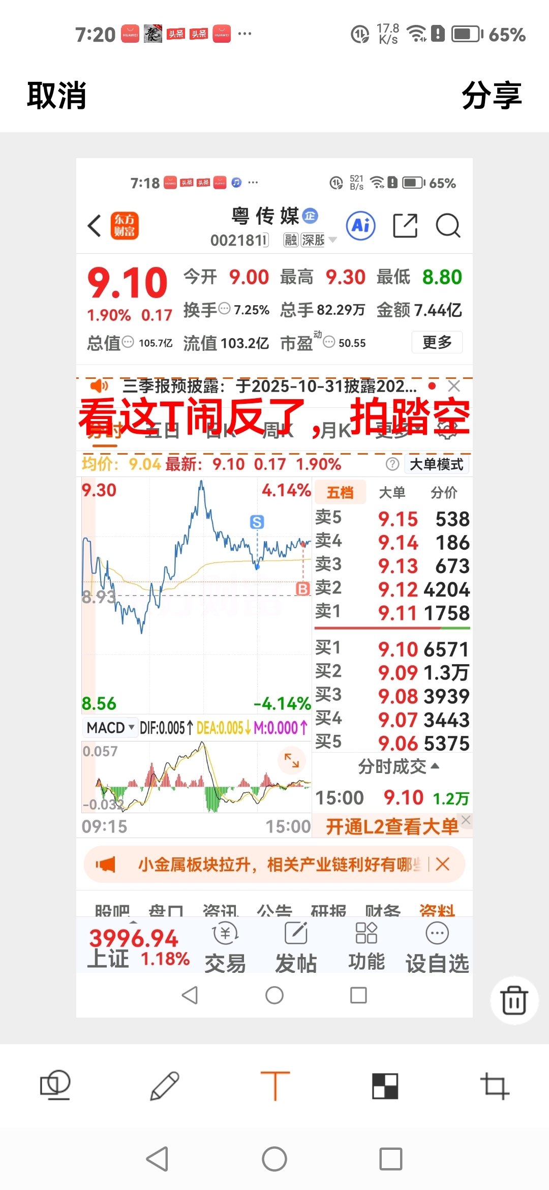 $粤 传 媒(SZ002181)$ 先看好,拉高时没卖,振仓时急速下跌时,怕了再跌就卖了一半(低点),随后拉升,又怕踏空,追高了,但愿后几天,随开全运动会而小步上升,不在作T了!