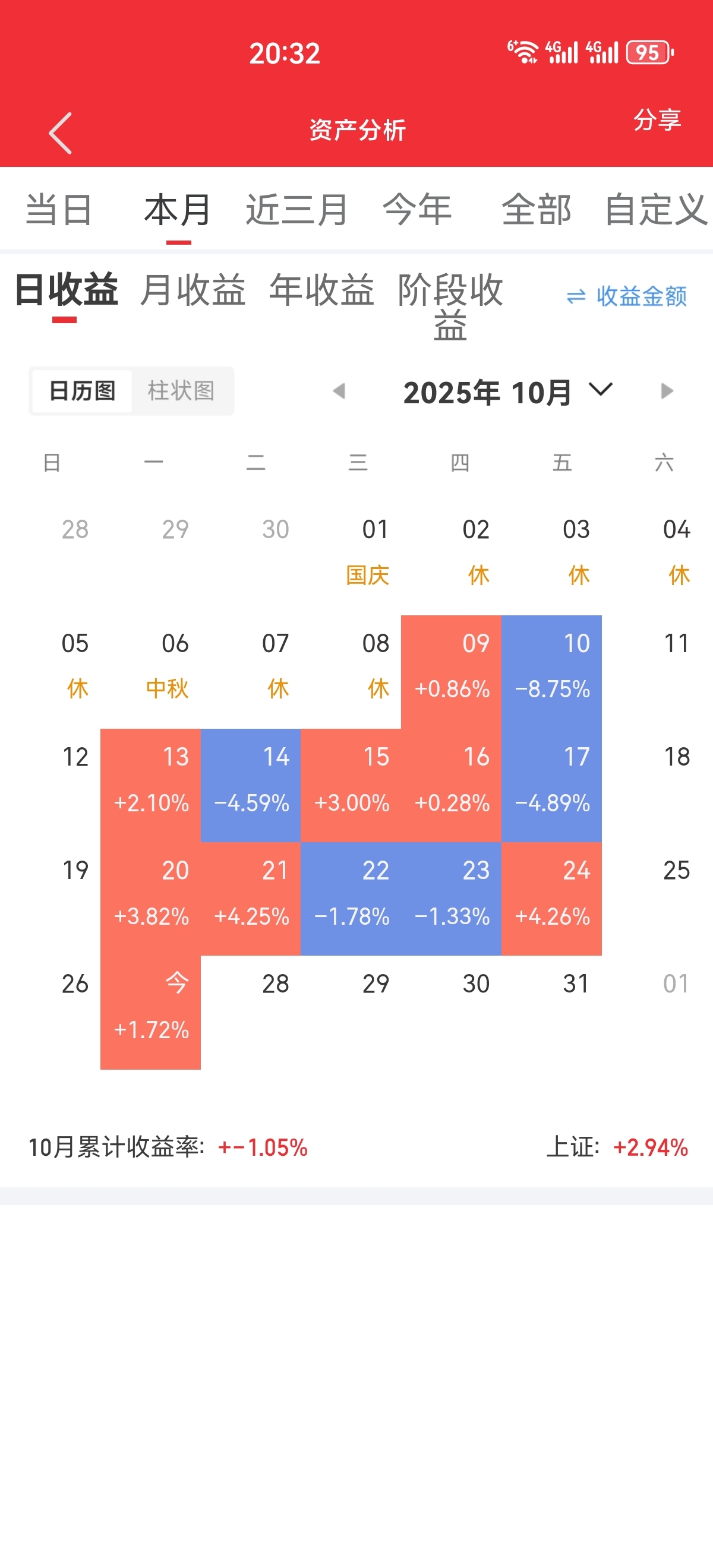 十月还有四个交易日了,看能不能追回来一点。前面大半个月真的是错过了太多。