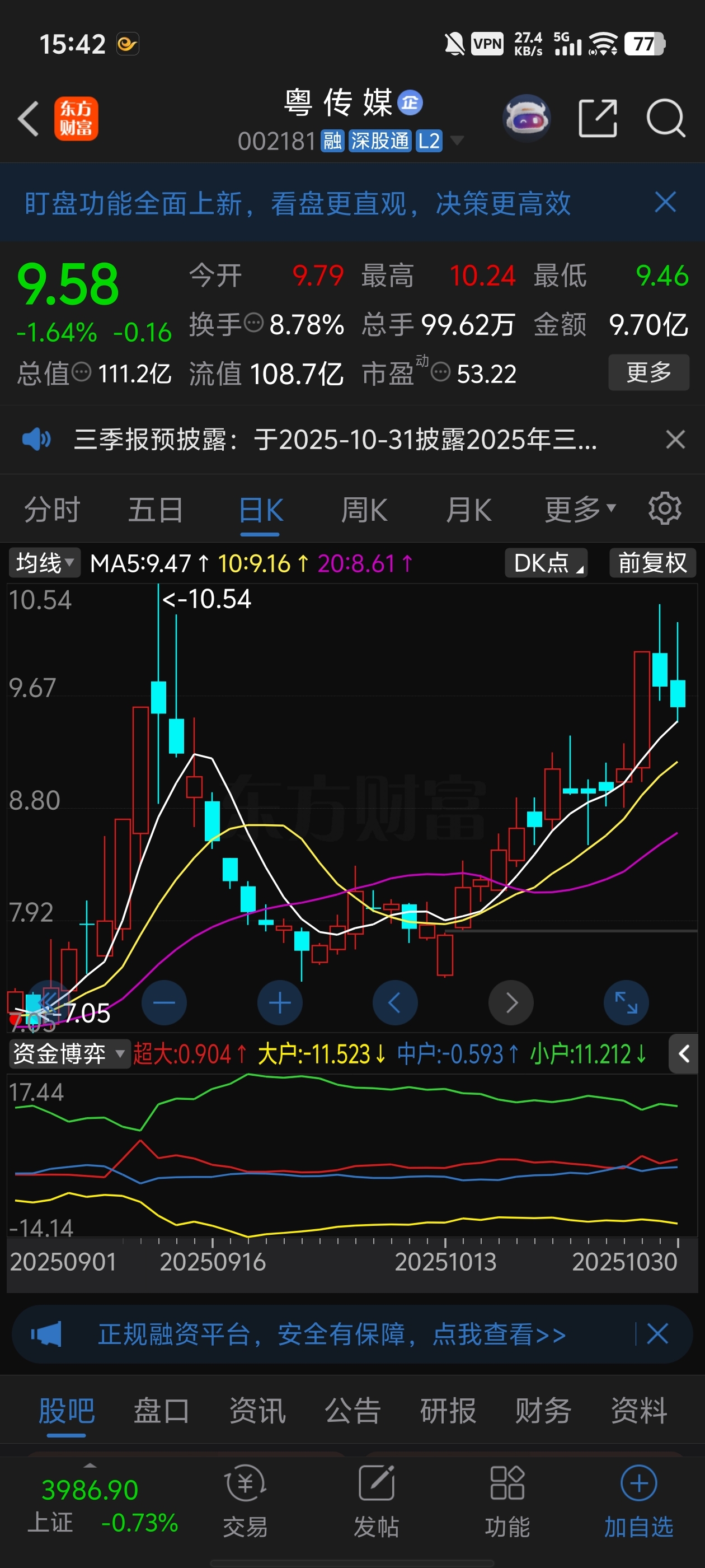$粤 传 媒(SZ002181)$ 前面的尖尖就是套你们的 958 救我吧 明天开始下跌趋势 还有今天一浪比一浪低就非常不对了