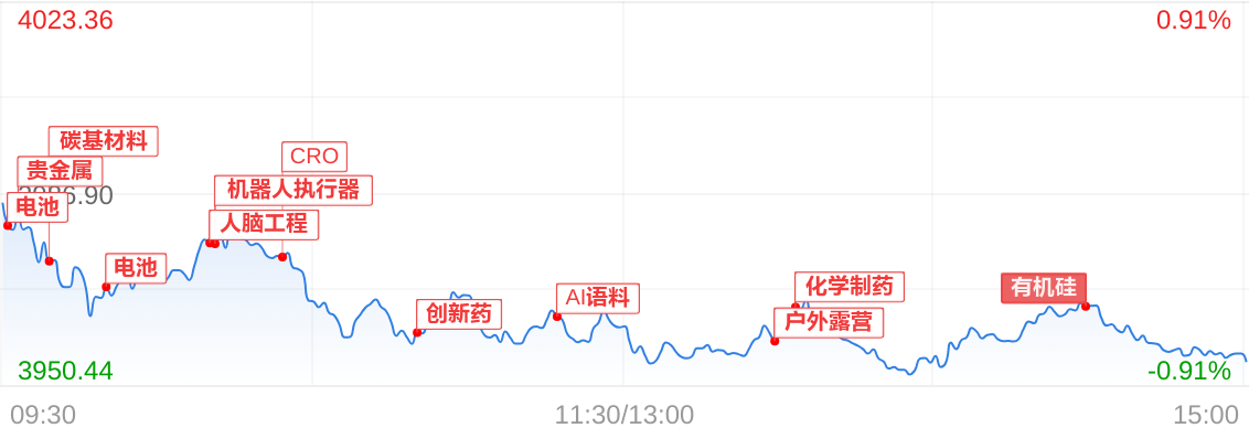 A股三大指数中创业板指领跌,截至收盘,上证指数下跌0.81%,深证成指下跌1.14%,创业板指下跌2.31%,北证50指数上涨1.89%。沪深两市成交额23177.92亿元,较上个交易日缩量1038.85亿。全市场3760只个股上涨。板块题材上,Kimi概念、AI语料、重组蛋白板块涨幅居前,高带宽内存、培育钻石、CPO概念板块跌幅居前。大盘表现