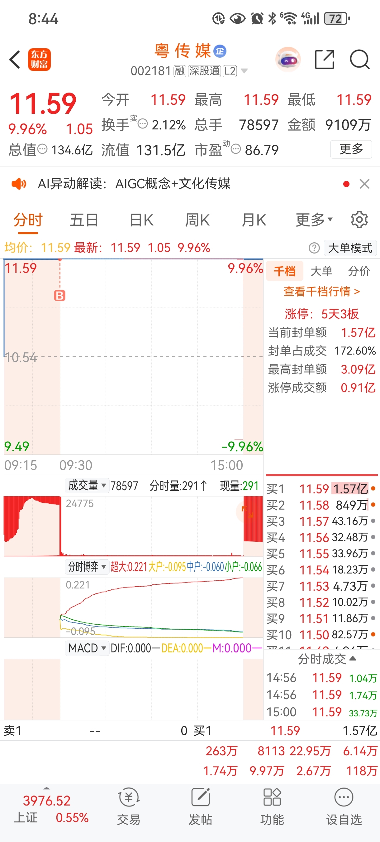 $粤 传 媒(SZ002181)$ 我为啥周末唱空?因为我怕买不到啊,其实我早就挂隔夜单了