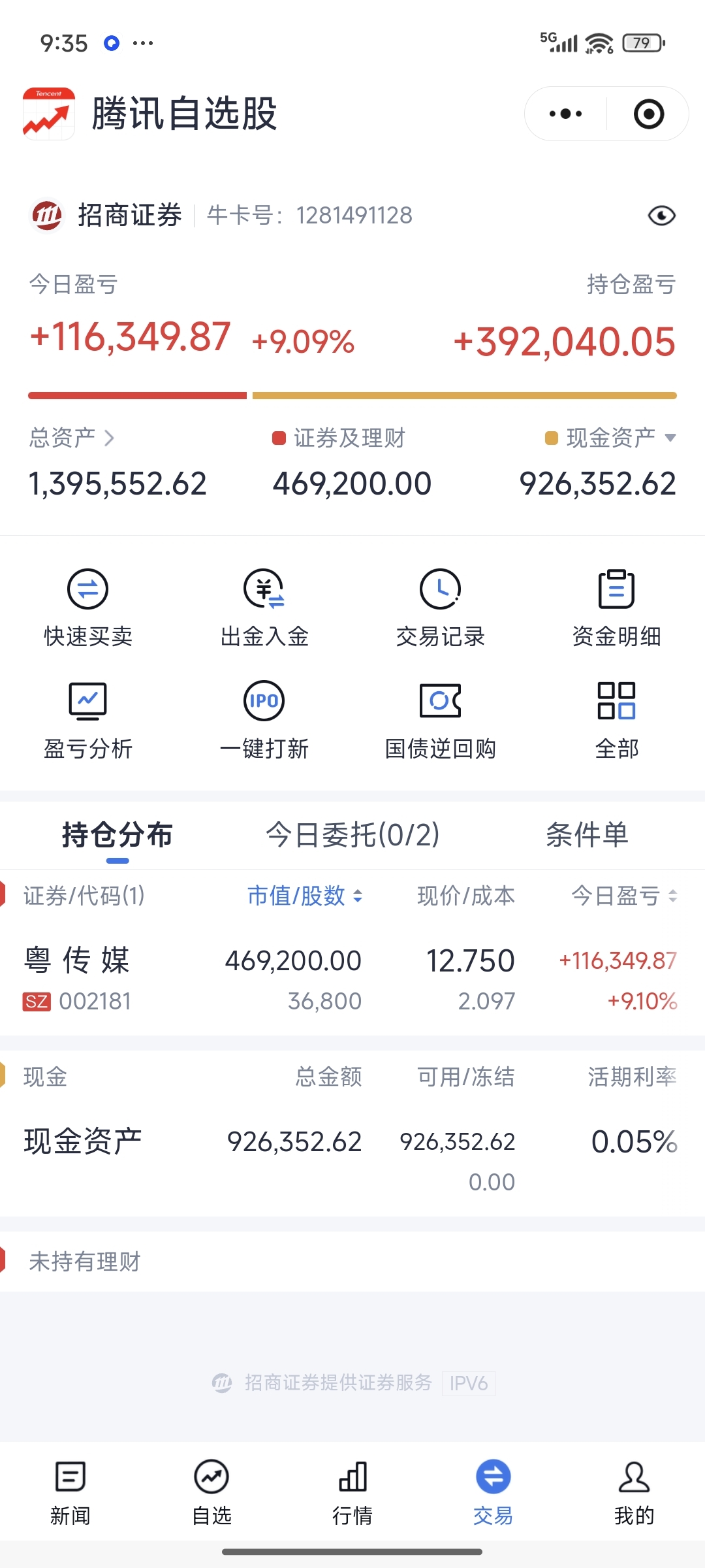 $粤 传 媒(SZ002181)$ 买了7成,就留了就留了三成四十来万博弈之后的涨幅