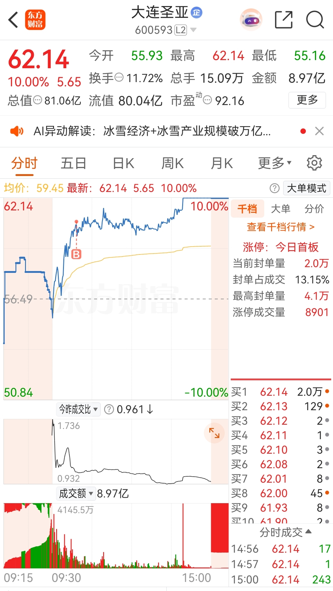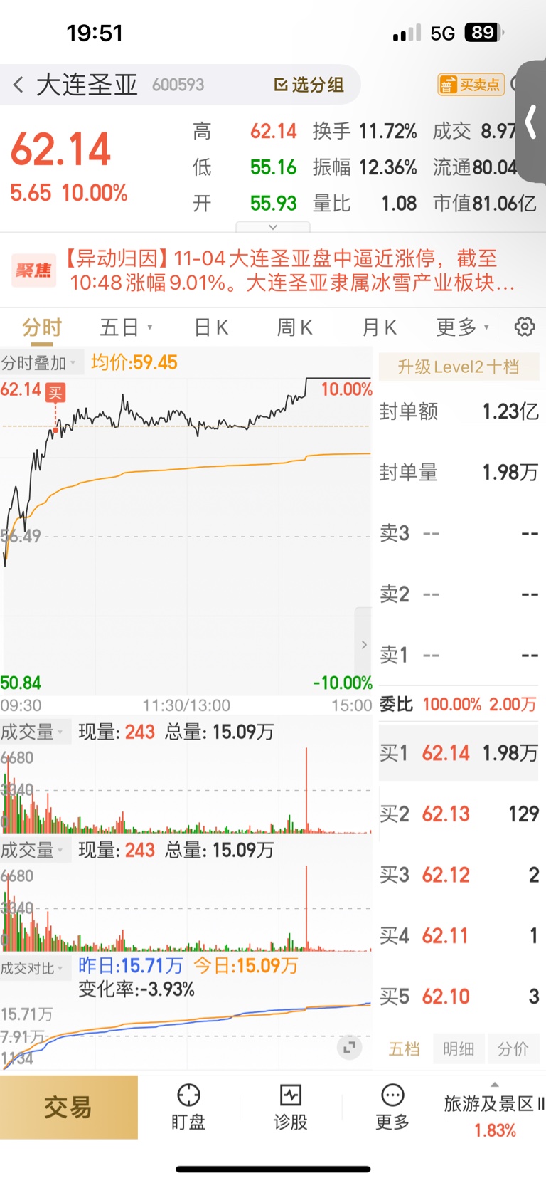 由于今天科技股和大盘明显走弱,同期大连圣亚强势上涨,所以我选择早盘追高买入。