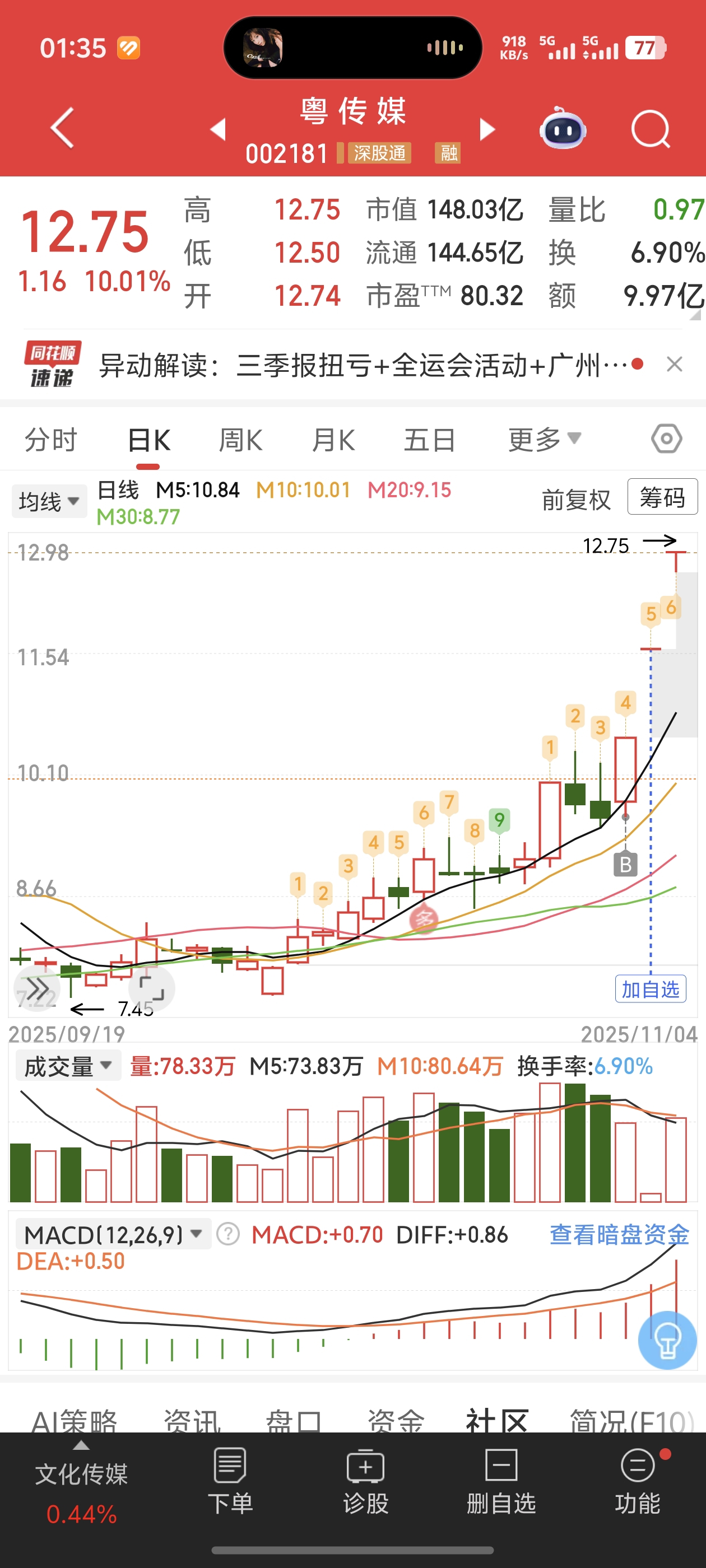 $粤 传 媒(SZ002181)$ 如果全仓就好了,可惜两成仓,不然账户就回本了