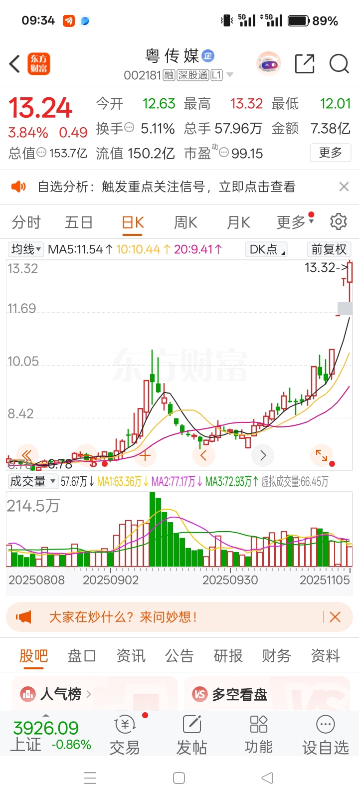 $粤 传 媒(SZ002181)$ 既然神州不甘示弱,粤兄弟,你也要继续雄起,强者恒强,上方利润空间可观,兄弟们,继续关注!等待起飞