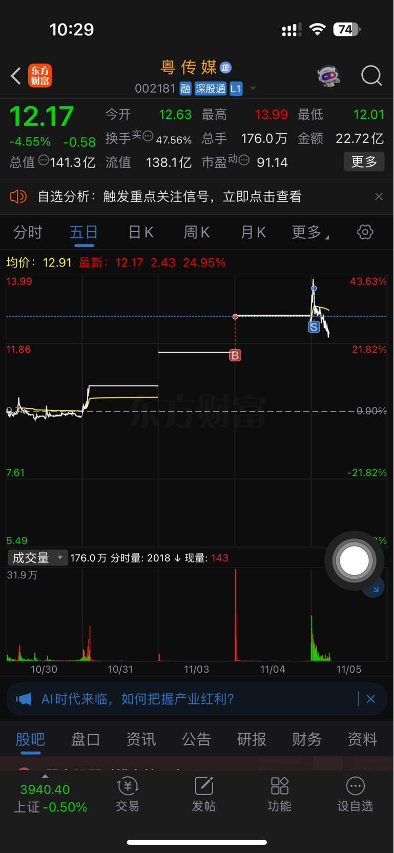 $粤 传 媒(SZ002181)$ 走了,老铁们。