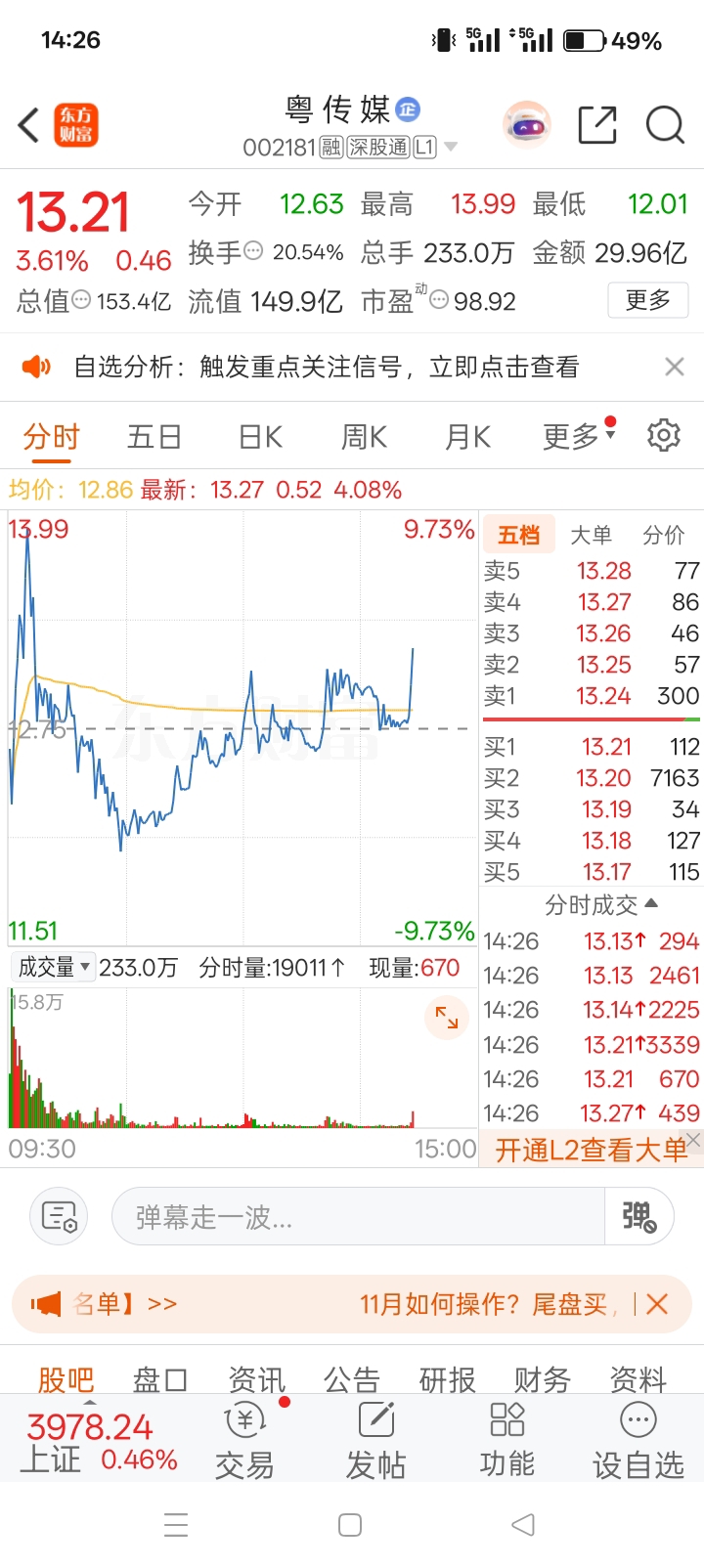 $粤 传 媒(SZ002181)$ 神奇的两点半开启,兄弟们,坐稳扶好!等待起飞