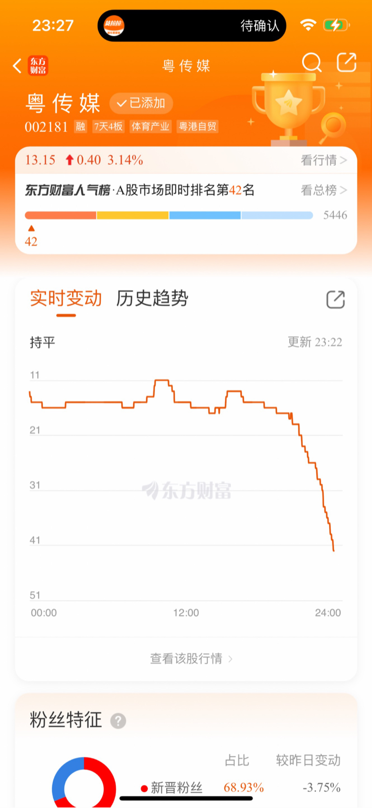$粤 传 媒(SZ002181)$ 前两天涨的原因文化传媒带动炒作全运会,现在写的是体育产业,粤港自贸,今天的暴力洗盘,是不是要操作粤港澳全运会了?好像快到预期了都还没炒作一下,好像11月2号到现在还没看到炒作呢!今天来了那么多大佬,打架不打架不知道哦,如果炒作起来不得了哦