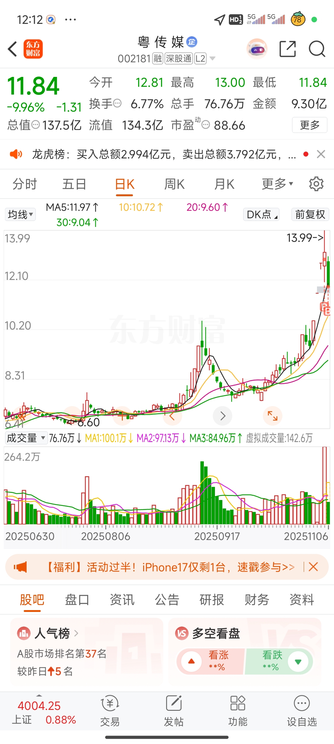 $粤 传 媒(SZ002181)$ 还好昨天没有全部梭哈,今天地板全部梭哈了。
