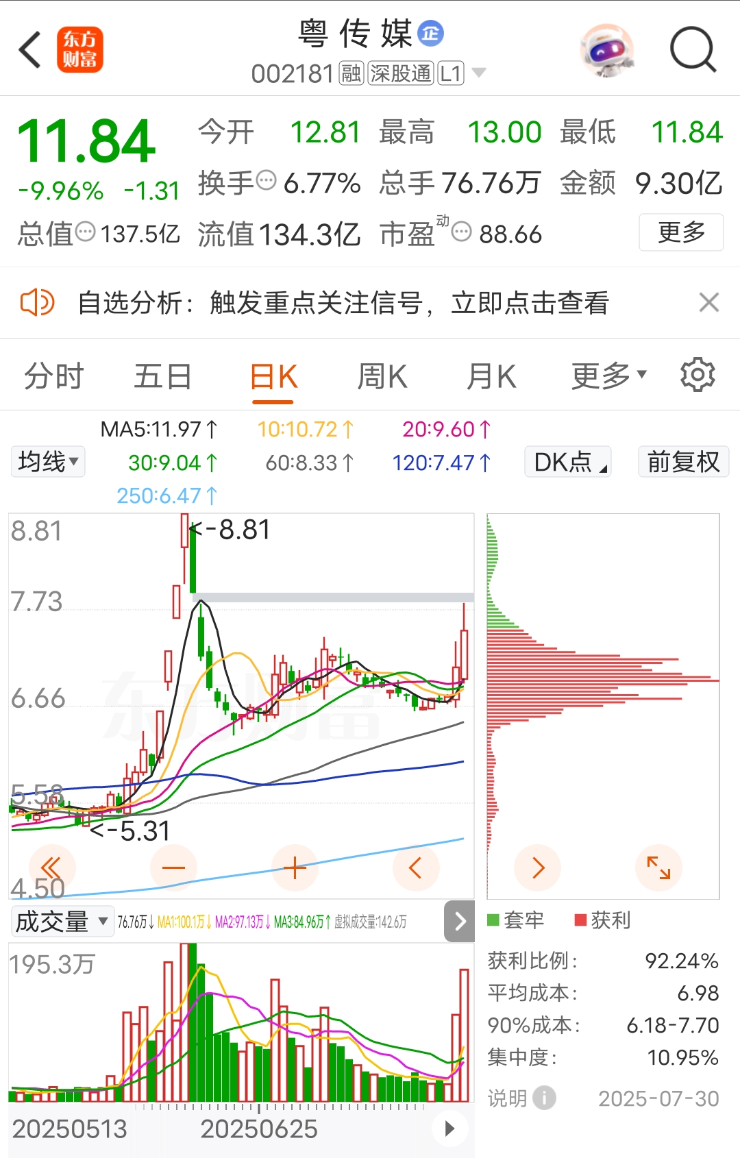 $粤 传 媒(SZ002181)$ 参考之前地板先不要买进