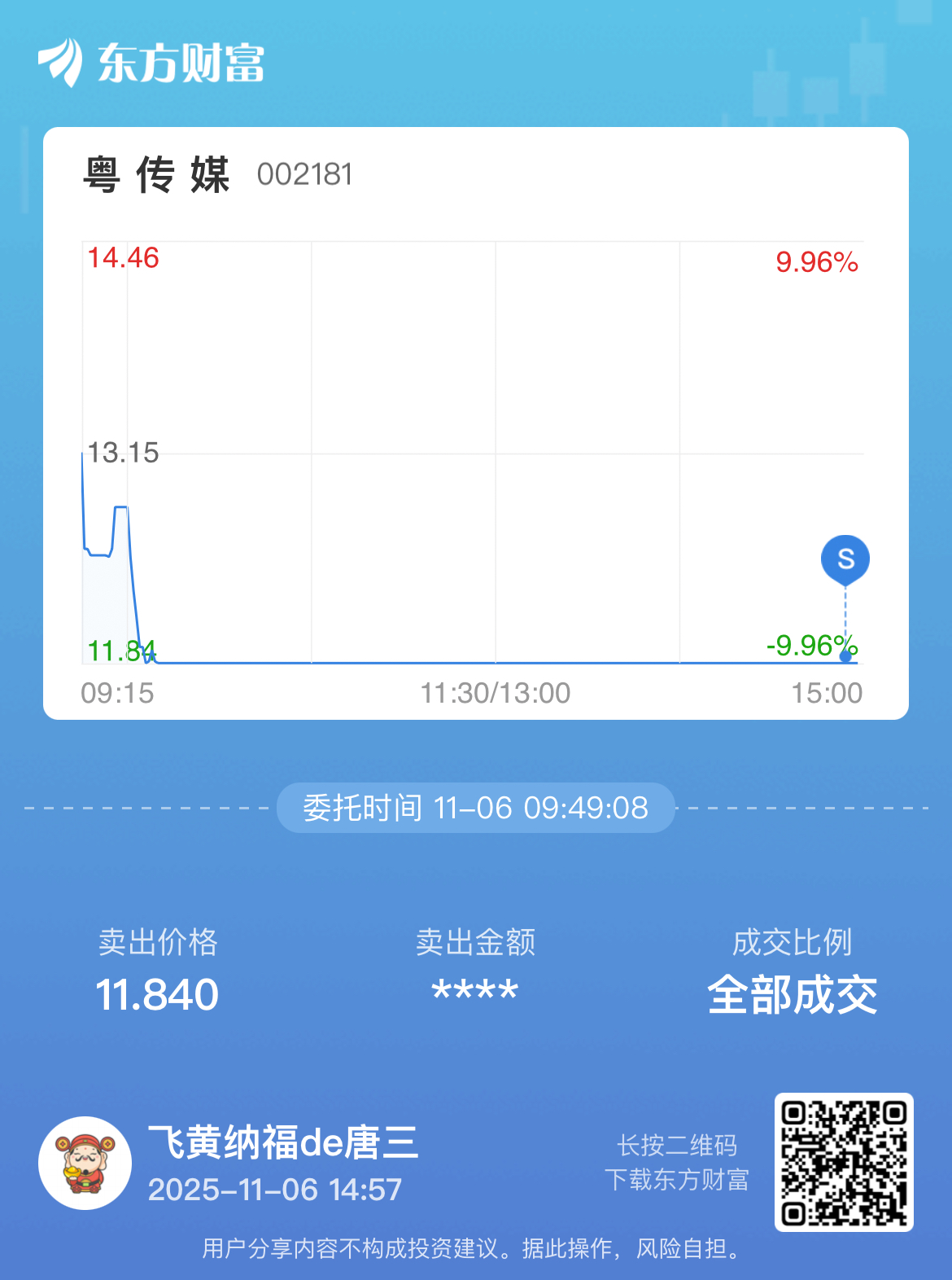 $粤 传 媒(SZ002181)$ 兄弟们,2.54分极限逃生,祝车上的兄弟们发财