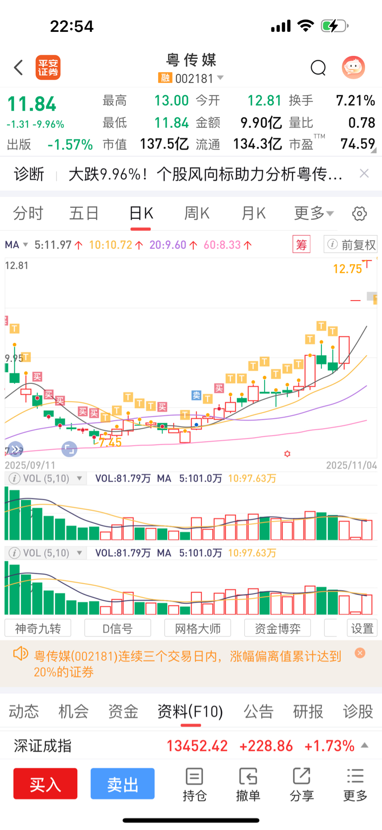 $粤 传 媒(SZ002181)$ 不要猜明天会怎么样,猜对了又能如何,不要去听股巴这些明天一字跌停影响到你,谁都不是神,股巴讲话从来不需要负责任,居然买了要么就割掉要么只能自己自救把成本做低一下,挂跌停买买了能拉起来就做T,拉不起来当加仓成本还是低了一些,等待周末看看有没有一波利好消息刺激,如果没有就放着等待跌稳了加仓做T,这个股是我玩过所有股最好T的票,下跌的时候躺平就行了!#复盘记录#