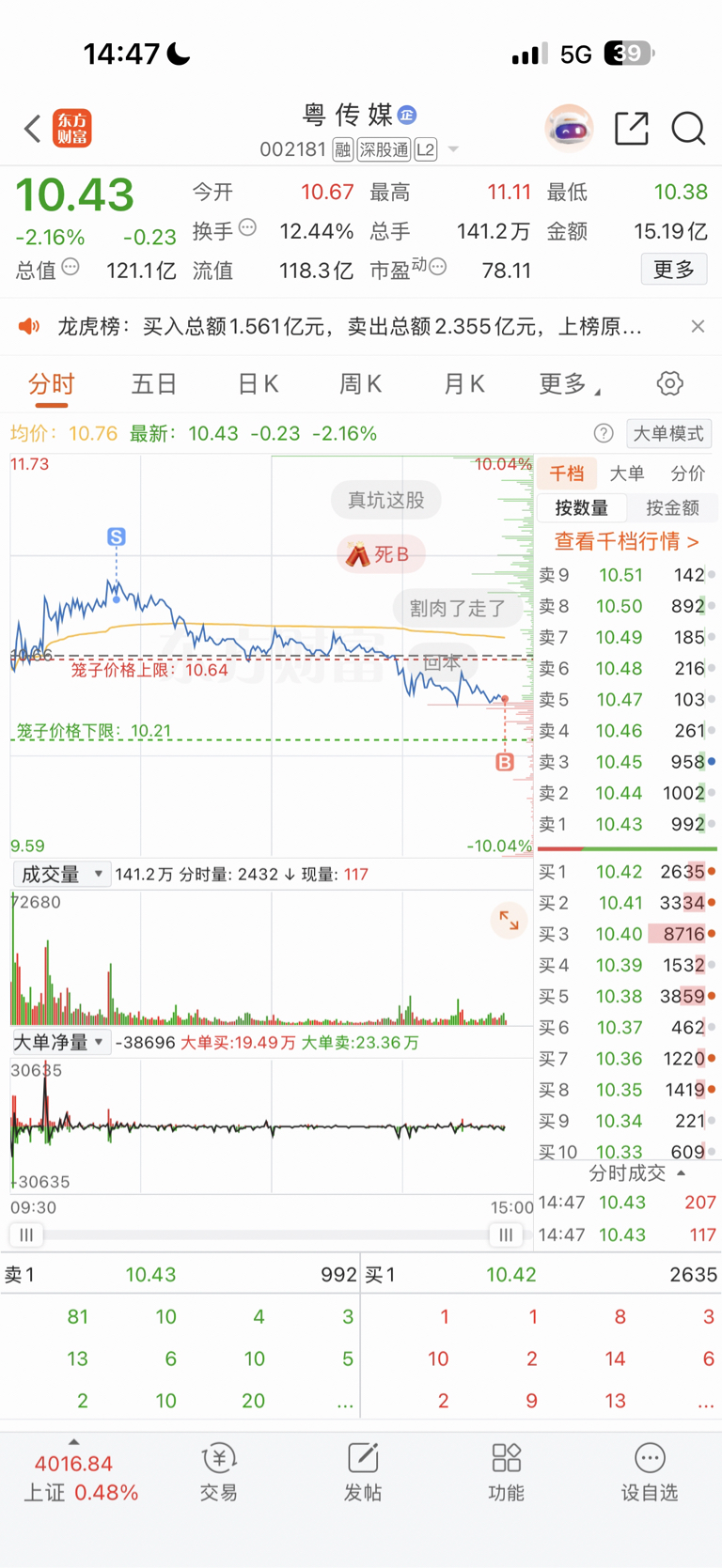 $粤 传 媒(SZ002181)$ 尾盘没钱了,只够一手