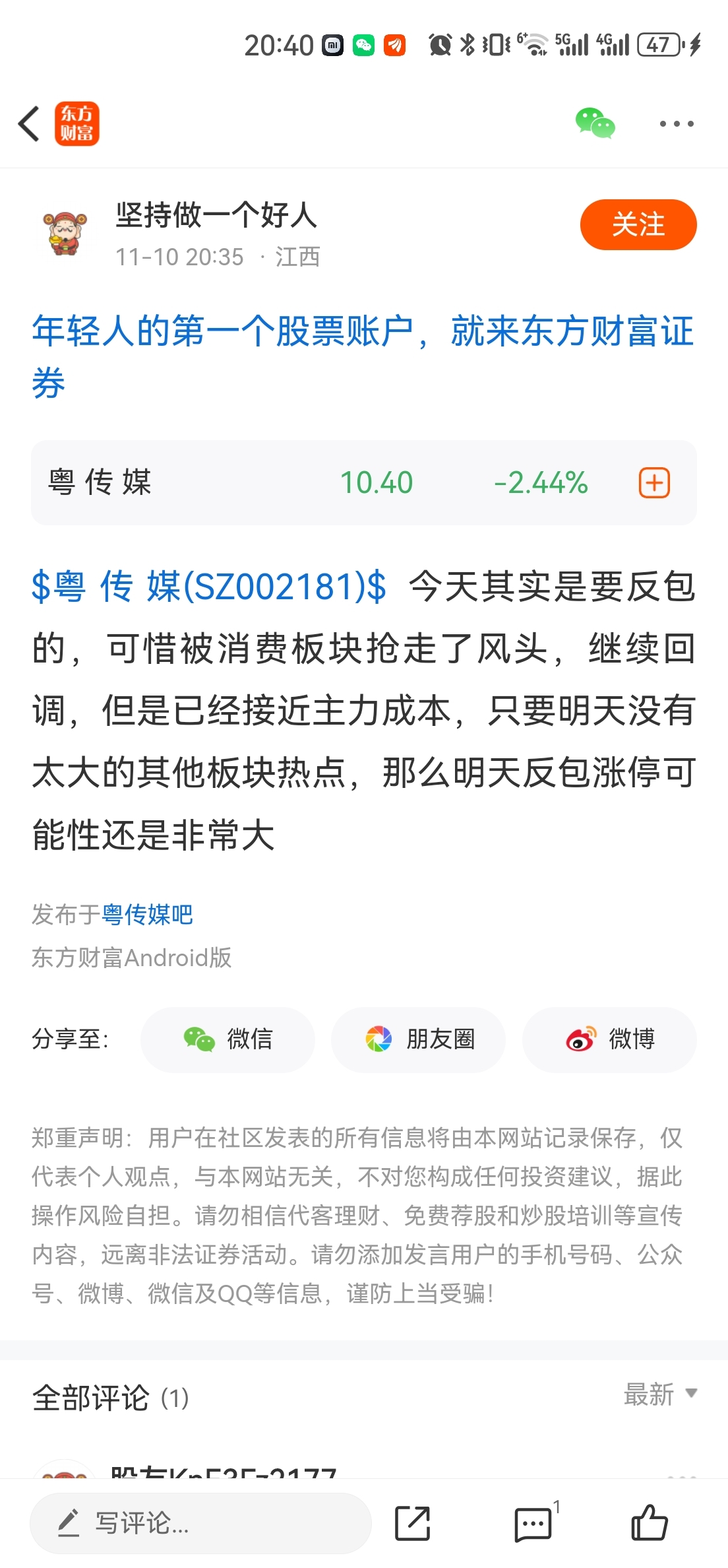 $粤 传 媒(SZ002181)$ #炒股日记# 我忍不住要发贴,一只传媒龙头股票,股性如此不好,直接a杀,还有人在发贴说明日反包和明日反抽。不管反包反抽,都不应该这样去发帖影响别人的判断,做股票不做预测,只做预案。收集一下近期涨的几个周期,基本都是涨多少跌多少。建议看了贴的人谨慎操作不要被一些水军影响要在空头趋势里面博反弹。