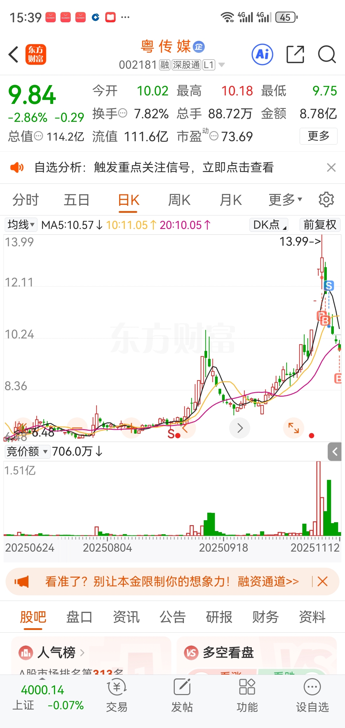 $粤 传 媒(SZ002181)$ 在你这亏了两个跌停,你明天必须还我一点点
