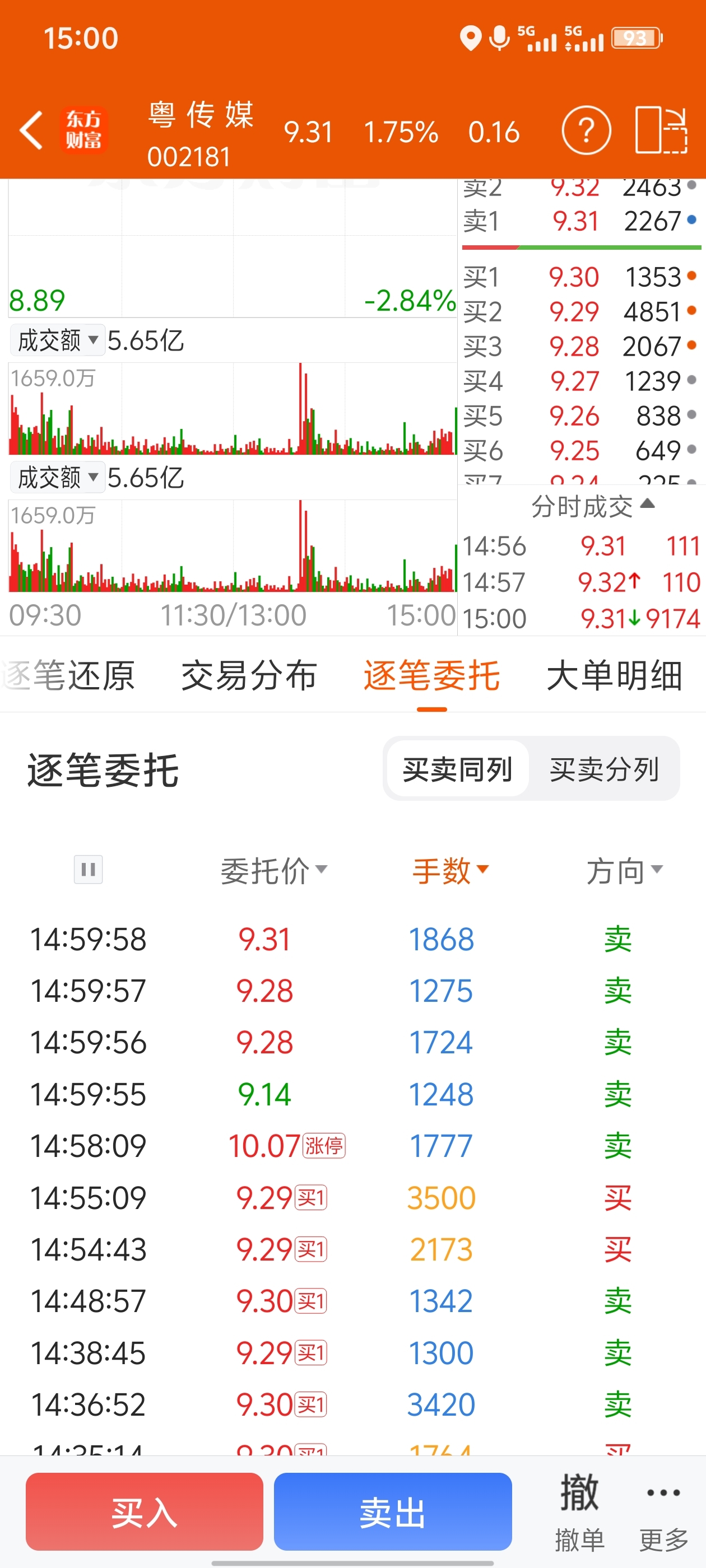 $粤 传 媒(SZ002181)$ 跟昨天一样,尾盘竞价大单苟抢跑,等钱