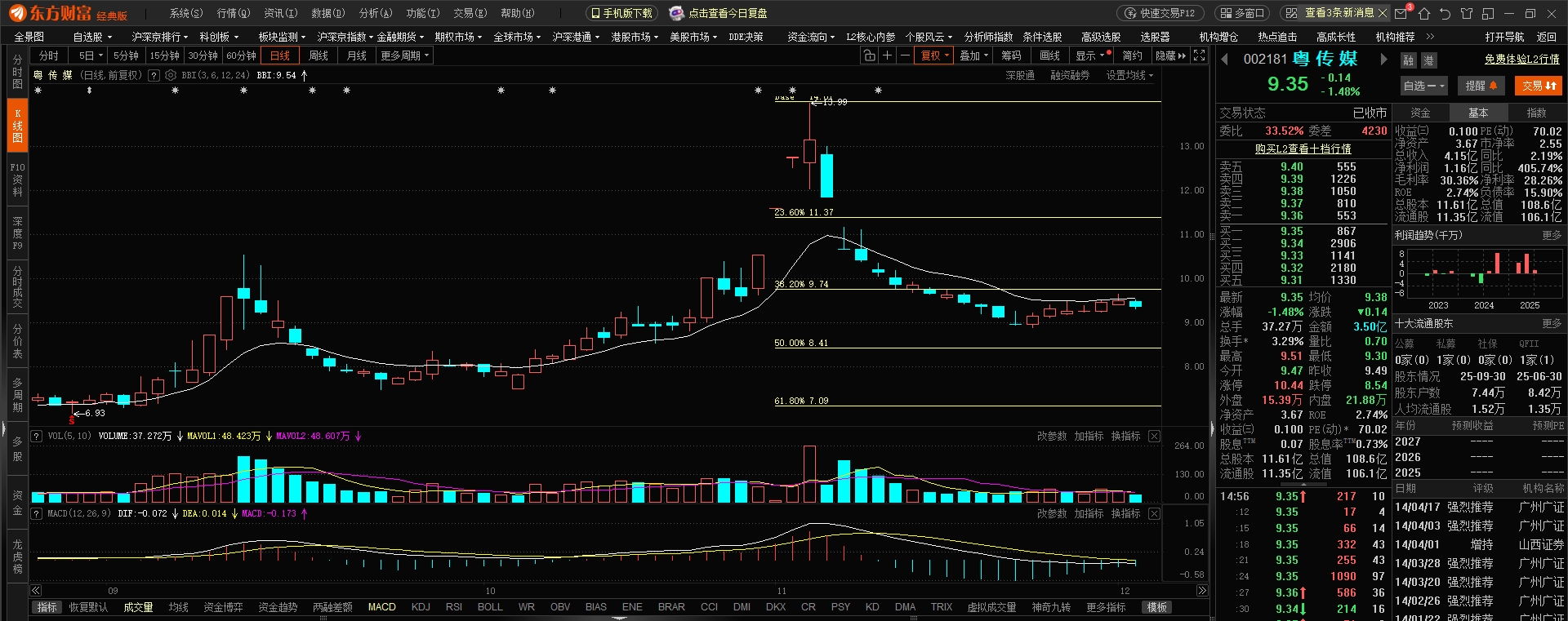 粤传媒今天上攻9.74失败,结束六连阳的趋势,明天不放量强势修复,大概率要回调到