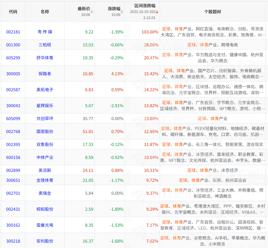 同时有体育和足球概念的票,粤传媒是22年世界杯开赛前1个月到赛程过半,涨幅最多的