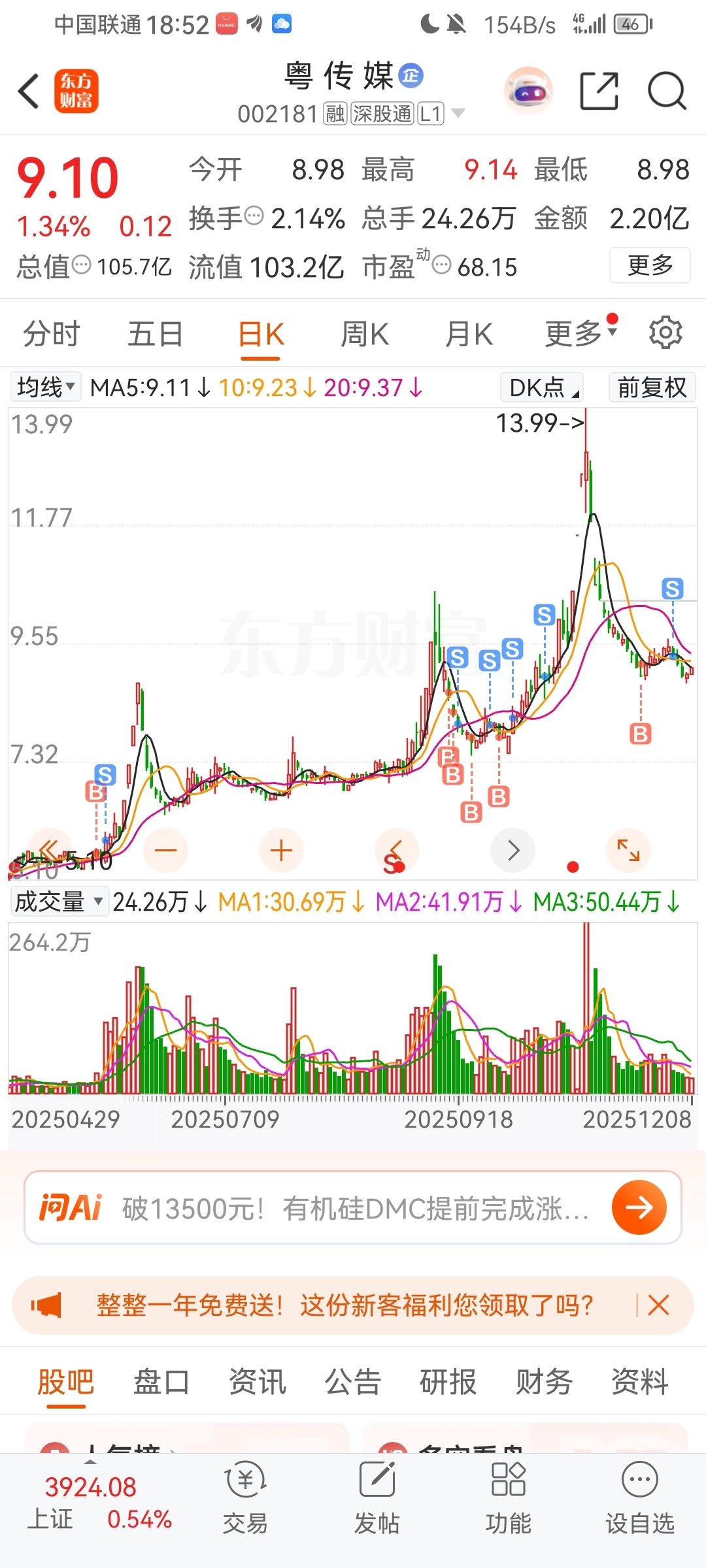 $粤 传 媒(SZ002181)$ 买的第一支股票就是粤传媒,都有感情了