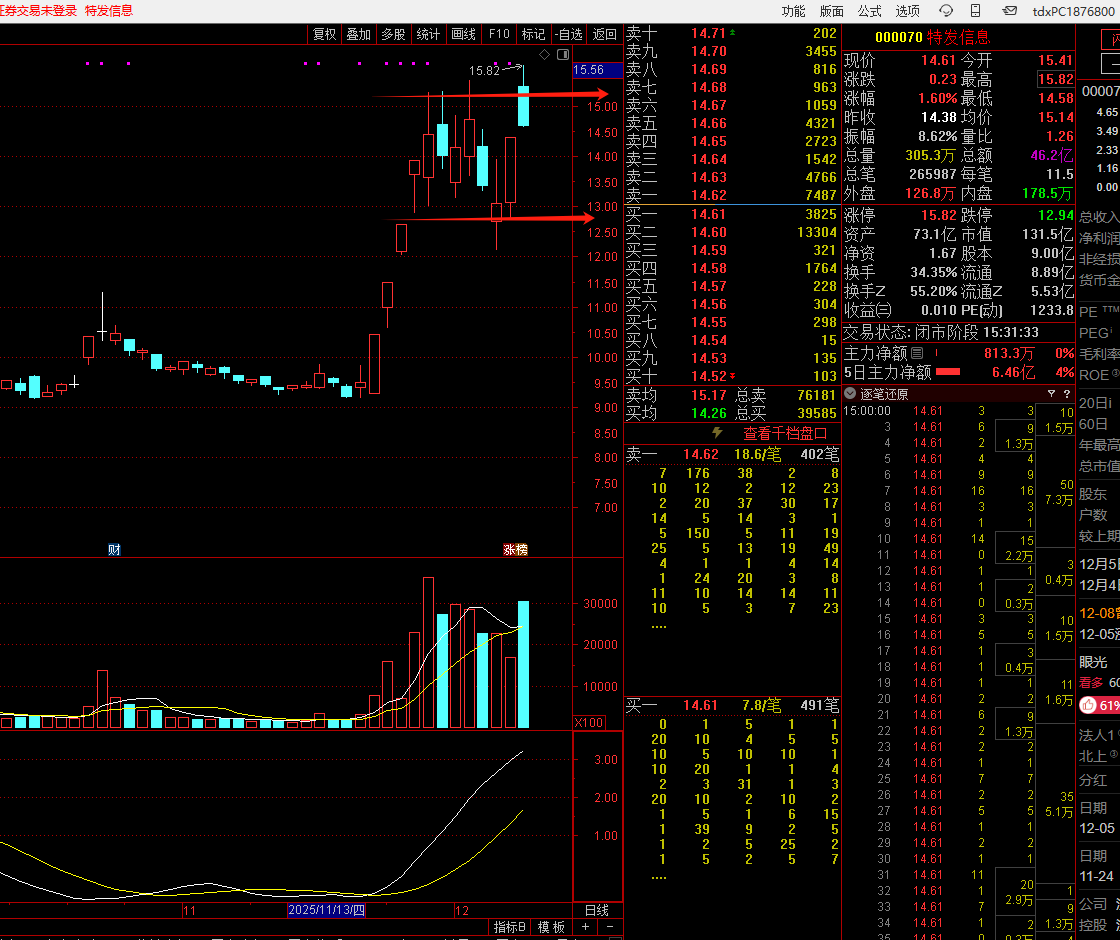 特发信息 000070:它主要是光模块+数据中心概念,从基本面看公司为谷歌数据中心提供MPO多光纤连接器,是高速光模块关键组件,用于设备互联;同时特发信息也是字节系的,特发信息董秘在多次投资者互动平台回复中明确表示:"公司向字节跳动提供光通信产品及综合布线服务等主营产品"。从资金面和技术面来看,特发信息第一波主要走的是谷歌概念,目前正尝试突破二波平台,从这俩天走势来看受高位股份影响相对较大,主要是航天发展这类,后续看能否走光通信这边转强与航发这边分离;从参宇维度来看,今日商业航天有分歧预期,那么特发信息若能主动修复并与航发这类票分离就存在参宇点,如若低开低走则放弃。