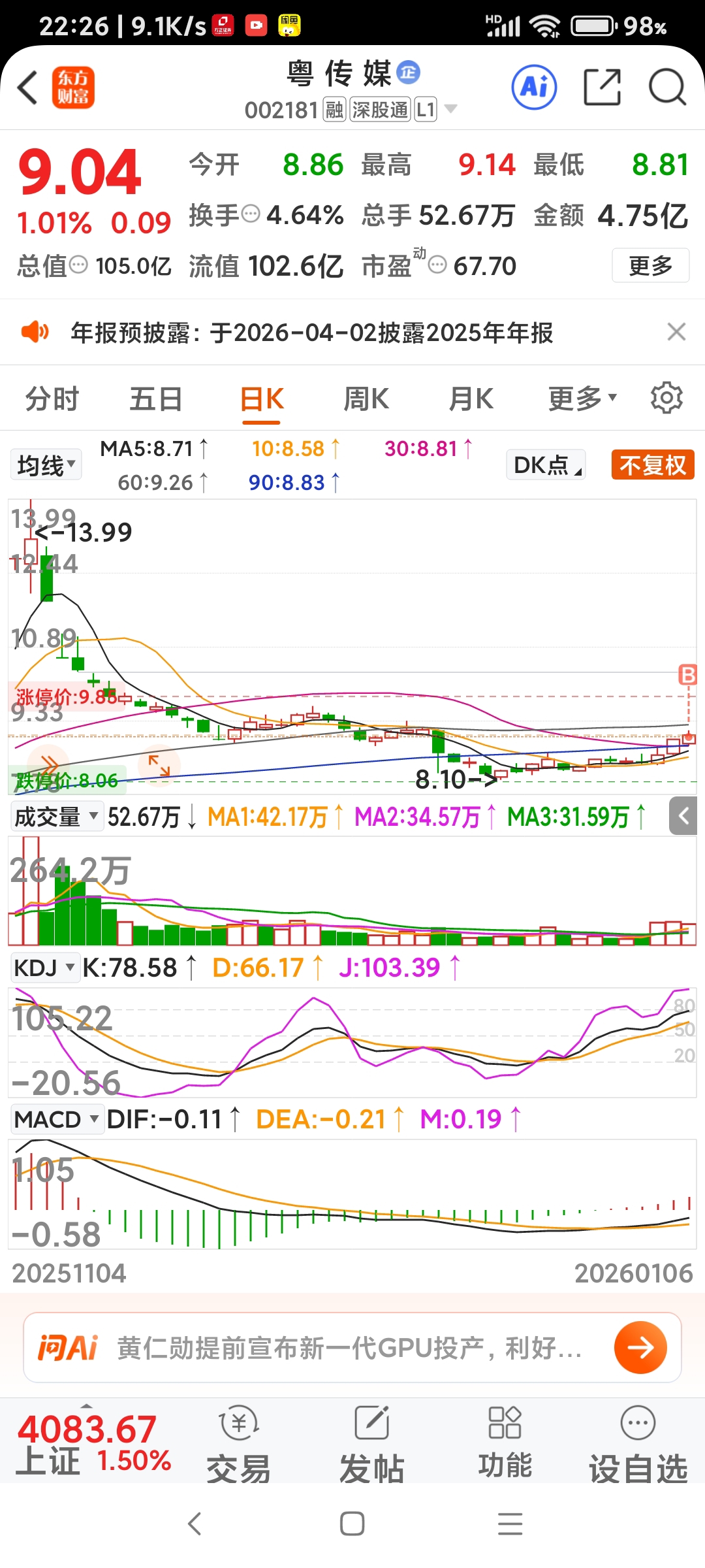 $粤 传 媒(SZ002181)$ 底部红三兵,三天温和放量,有启动迹象。