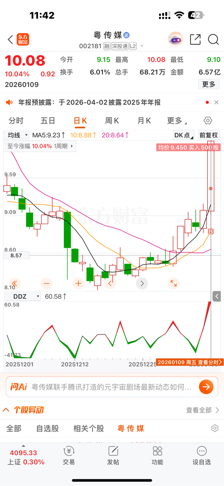 $粤 传 媒(SZ002181)$ 哎赌一把赌对了、可惜钱太少了