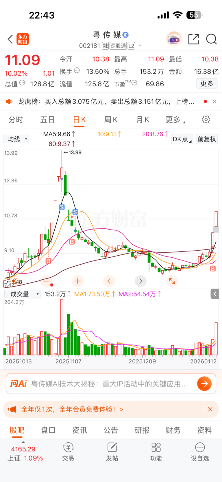 $粤 传 媒(SZ002181)$ 每次来都能喝口汤,但是股性确实不是很好所以每次仓位都比较少哈哈