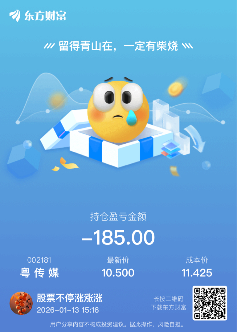 $粤 传 媒(SZ002181)$ 等于吃了一个地板,红3买的,还不如在商业航天不动,求兄弟们安慰,谁有我惨