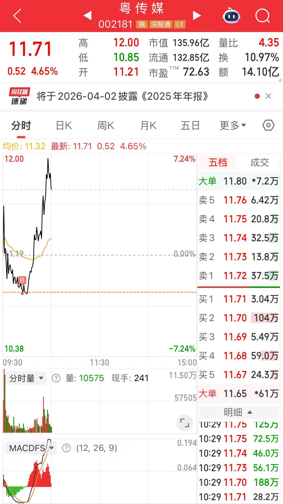 记录一下,10.88全仓买了粤传媒,昨天全仓买的远东股份卖掉吃3点肉肉。说好的上午不买股