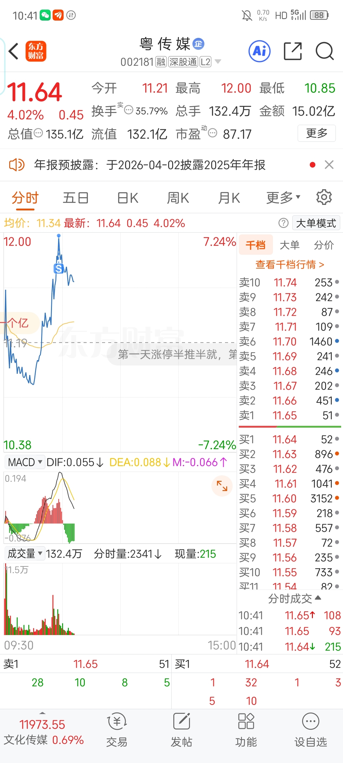 $粤 传 媒(SZ002181)$ 撤了。感谢主力