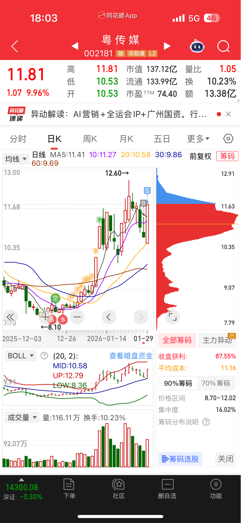 $粤 传 媒(SZ002181)$ 早上半山腰卖了 可惜了