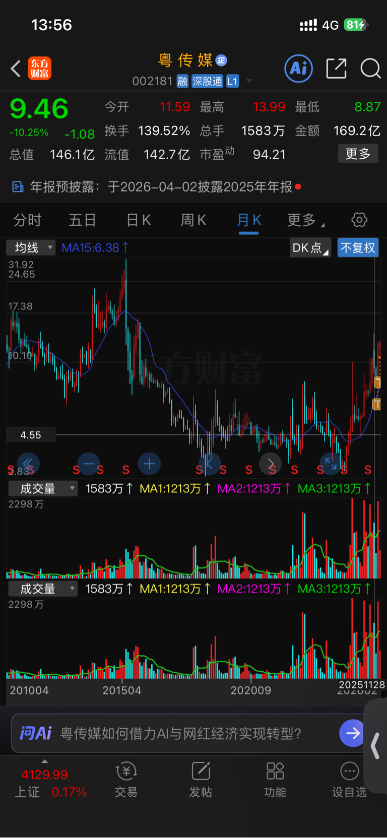 $粤 传 媒(SZ002181)$ 看一下13.99的成交量就知道了,我敢说这盘子不存在套劳盘,不会以为2015的筹码砸的吧,那筹码加分红早就下来了,这盘子要么主力在做T,要么在出货,要么洗盘。大家心里有数就行了,不要被拖骗走