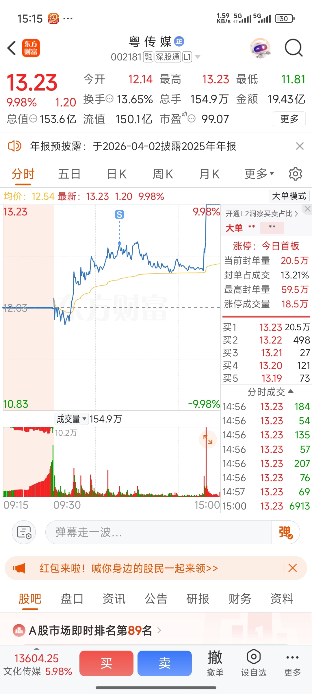 $粤 传 媒(SZ002181)$ 害,打算尾盘几分钟接回来的